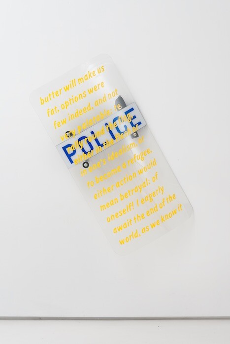 In Riot Shield: Butter (2012), at Roberts and Tilton, Los Angeles, Daniel Joseph Martinez puts in the face of the viewer words stemming from the diversionary tactics of patriotic ideology in response to charged moments such as the Cuban Missile Crisis. He does so by hand-painting letters from a semi-apocalyptic text on transparent plastic police riot shields. Martinez uses the same technique to confront viewers with the different effect of ironic beauty in Riot Shield: Cherry Blossom (2012), by sharing through his lettering the aching lines in Donald D. Walsh’s translation of Pablo Neruda’s Residence on Earth (1933–1947) representing individual figures who might be moved to revolution: