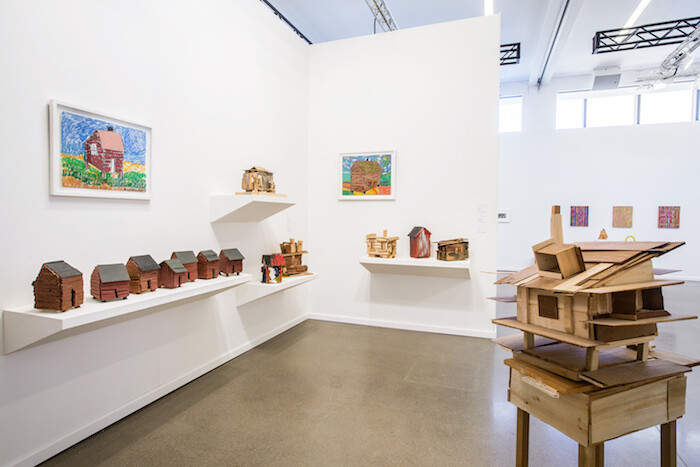 Among highlights this year were works by a number of unschooled, self-taught, and/or older artists whose idiosyncrasies manage to cut through the clutter of the fair’s densely filled spaces. Among them, a good range of sculptures and drawings by Beverly Buchanan at Andrew Edlin, New York, coming off the just-closing high of Buchanan’s posthumous retrospective at the Brooklyn Museum. The smaller-scale moment at Independent delivers the kind of intimacy that makes sense with the type of re-creations that Buchanan dedicated her creative output toward: the smaller-scale replications of the seemingly casual, vernacular architecture of rural shacks and D.I.Y. buildings. The ramshackle nature of these reconstructions in miniature can seem slapdash and confusing, but now more than ever the sweet differences that these alternatives provide to utilitarian cookie-cutter housing and other contrived sculptural practices is winning.