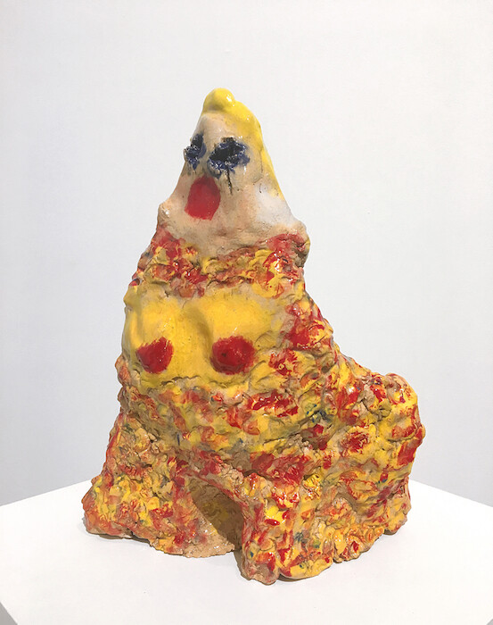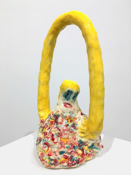 Alice Mackler’s brightly colored ceramics at Kerry Schuss, New York, offer a series of lively yet distorted figures who all seem vulnerable to some greater emotion than mere paint and porcelain in bright colors should be able to manage. Details that run from sometimes ambiguous to just readable add to the sense that the sculptures’ arrested poses morph in front of one’s eyes.