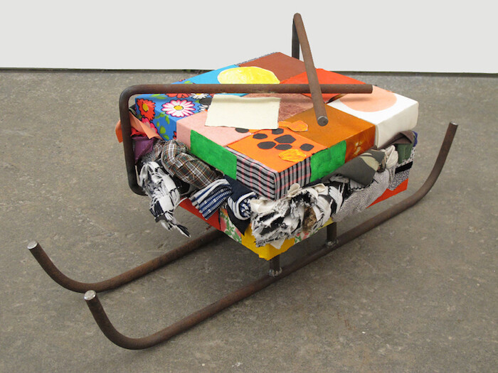 Better known now but still startling in their evocations, Nancy Shaver’s series of intricate combos of repurposed objets at New York’s Derek Eller loom in their small way like obsessively rearranged playthings that have the ineffable presence of a story half-told. Custom-made and colored blocks, rusted rebar bent to resemble sled runners, holders and footing for sculptures of commercial fabrics, partially folded but also wadded up and arrayed in patchwork create small tableaux with dark auras creeping out along the edges of the combined elements. Viewing each one is like being a stranger-guest sifting through the Christmas packages in somebody else’s home in another country.