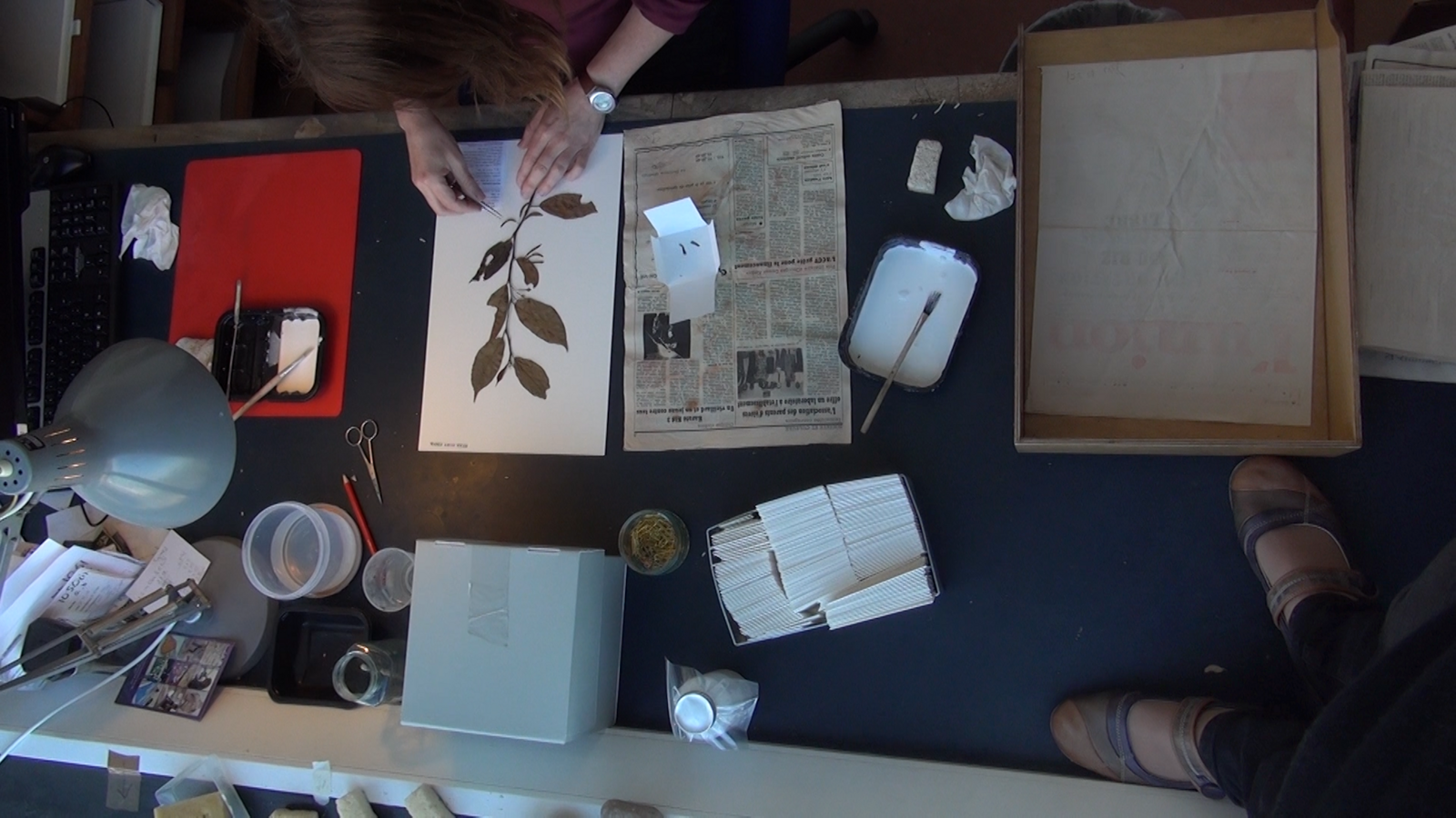 Davis’s work was exhibited in a small room with a vitrine of corresponding specimens from the RBGE herbarium (a subtle gesture of self-implication). A volunteer invigilator engaged visitors in conversation about the work; people took their time, paid attention. Through the door, Mann’s film essay, A Desire For Organic Order (2016), lingered upon the aesthetics of RBGE’s archive and herbarium. The film shows labels and boxes, hands caring for specimens so very gently. A voiceover describes botanic gardens as “processing centers for the biological spoils of exploration.” The film spoke softly, maybe too softly, while the room’s architecture encouraged through-traffic and few people stayed to hear what they needed to hear.