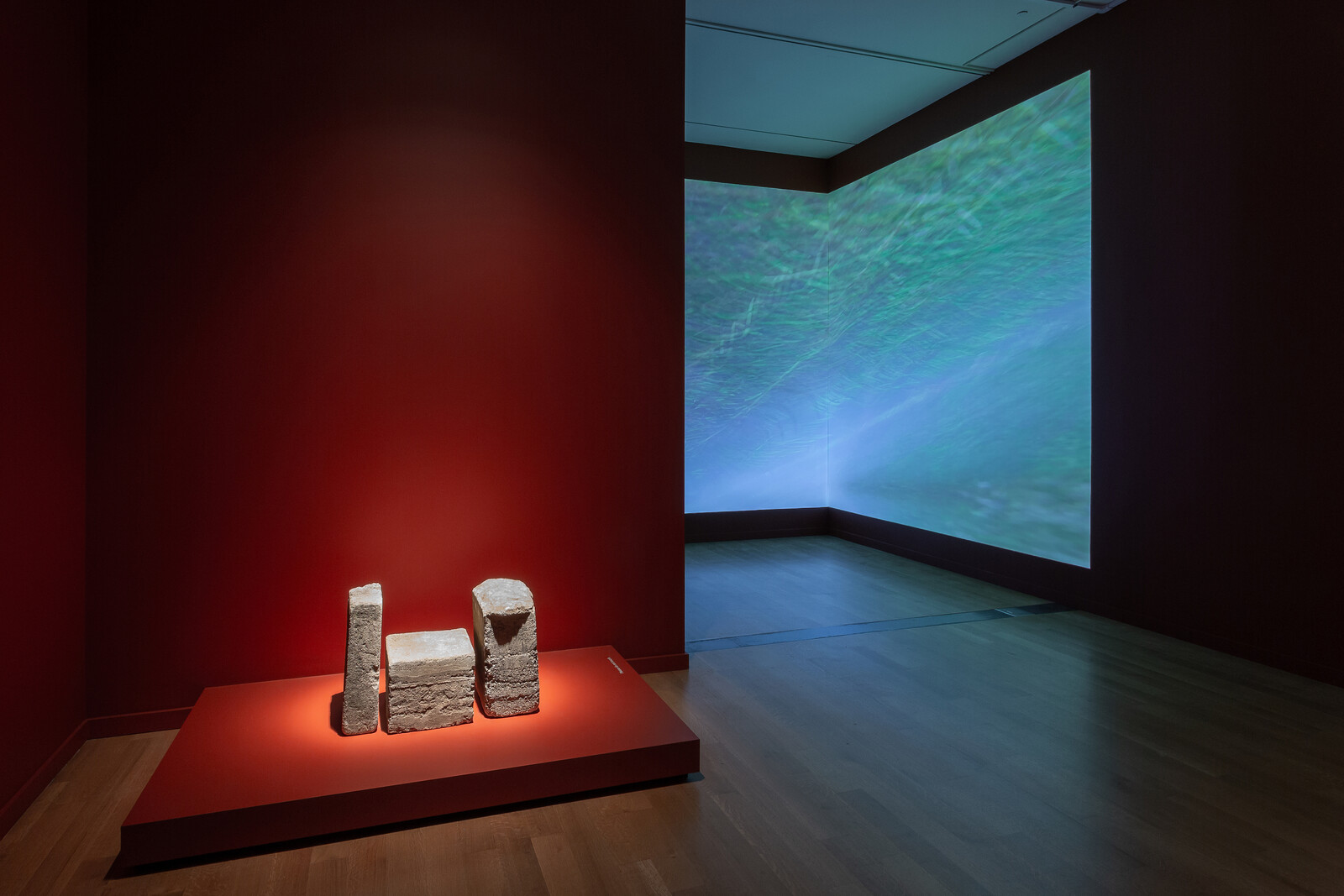 The show opens with a modified 1990 Cadillac called a SLAB (short for Slow, Low, and Banging) owned by rapper Fiend aka International Jones, which highlights the link between music and material culture. Summer Breeze (2018) by Paul Stephen Benjamin emphasizes the theme. This pyramidal arrangement of TV monitors showing Billie Holiday and Jill Scott singing “Strange Fruit” sets a haunting tone. Nearby, Beverly Buchanan’s abstract sculpture Untitled (Frustula Series) (c. 1978), a trio of concrete blocks placed on a low plinth, nods to Southern vernacular architecture. Projected onto a nearby wall is Allison Janae Hamilton’s 2019 video Wacissa, which dips the camera just below the surface of water. It’s a disorienting experience that places the viewer in a dense tangle of reeds.