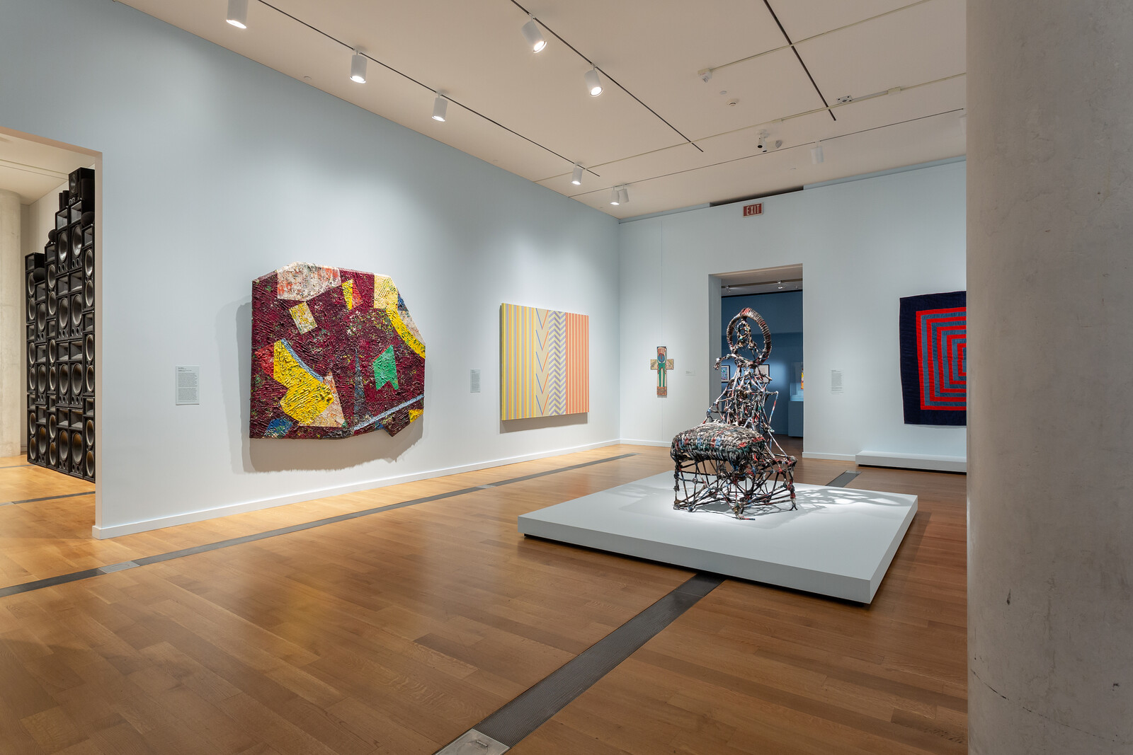 STAGED, Slugs’ Saloon (2018), an installation by Jason Moran, depicts a hallowed space in the history of jazz: the eponymous East Village saloon here recreated with a jukebox, cello, drum kit, and other props displayed against a painted backdrop. Placed in relation to Revival Meeting, a 1994 painting by Benny Andrews depicting a rocking revival hall, it points to the intersection of music and spirituality. Around the corner is Coronation Theme: Organon (2008), a monumental sound work by Nadine Robinson made up of a tower of speakers, shaped like Atlanta’s Ebenezer Baptist church, and a mashup of Handel’s “Coronation Anthems” with sounds of fire hoses and attack dogs from a 1963 civil rights demonstration in Birmingham, Alabama. Directly opposite is Joe Overstreet’s Saint Expedite I (1971), an abstract sculpture that includes colored shapes of green and black canvas anchored to the floor and ceiling by ropes tied off with noose knots. An adjacent room of abstract works includes Sanford Biggers’s Khemestry (2017), a fractal-like wall piece combining antique quilts and gold leaf on plywood, and Sam Gilliam’s 1980 painting Purpled (Chasers) inspired by the flying geese quilt motif—both pieces reference the history of hidden messages in quilts used along the underground railroad.