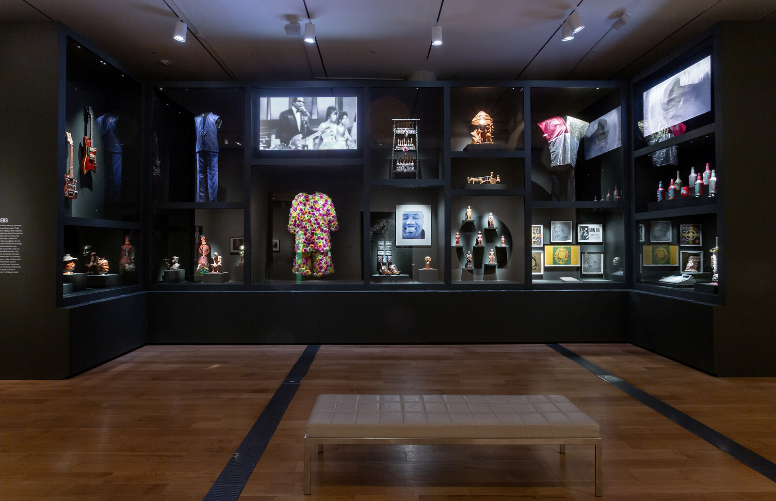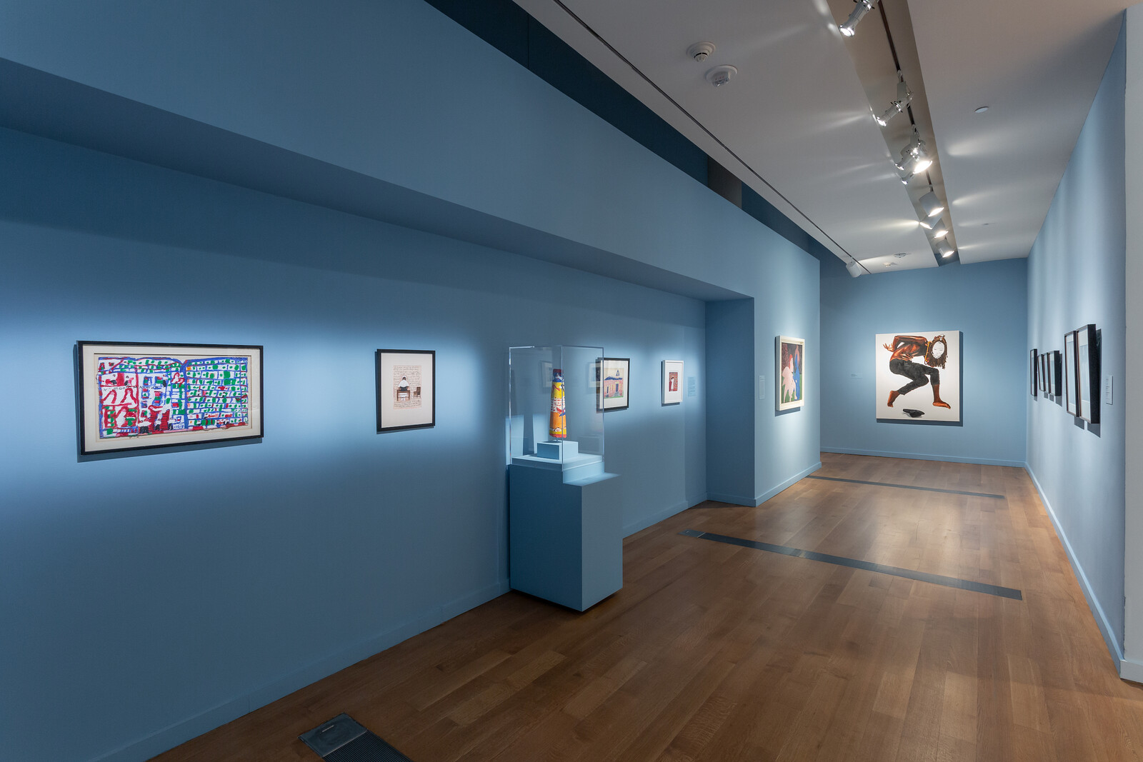 “The Dirty South” features a number of vernacular artists, such as Sister Gertrude Morgan whose gospel songs are played alongside her colorful drawings. This element of performativity is linked to New Orleans procession culture with King of Arms, a 2015 video performance by Rashaad Newsome that combines Mardi Gras Indians, queer ballroom dancing, and a marching band. This stunningly effective mashup exemplifies another quality of the South: the elaborate, synthetic set of rituals that joyfully embrace the carnivalesque as an antidote to repressive forms of power. In the following room is a wunderkammer-like series of display cabinets that include ephemera from Sun Ra, James Brown, and CeeLo Green along with stoneware pots, a diamond-encrusted grill, and mixtapes by DJ Screw.