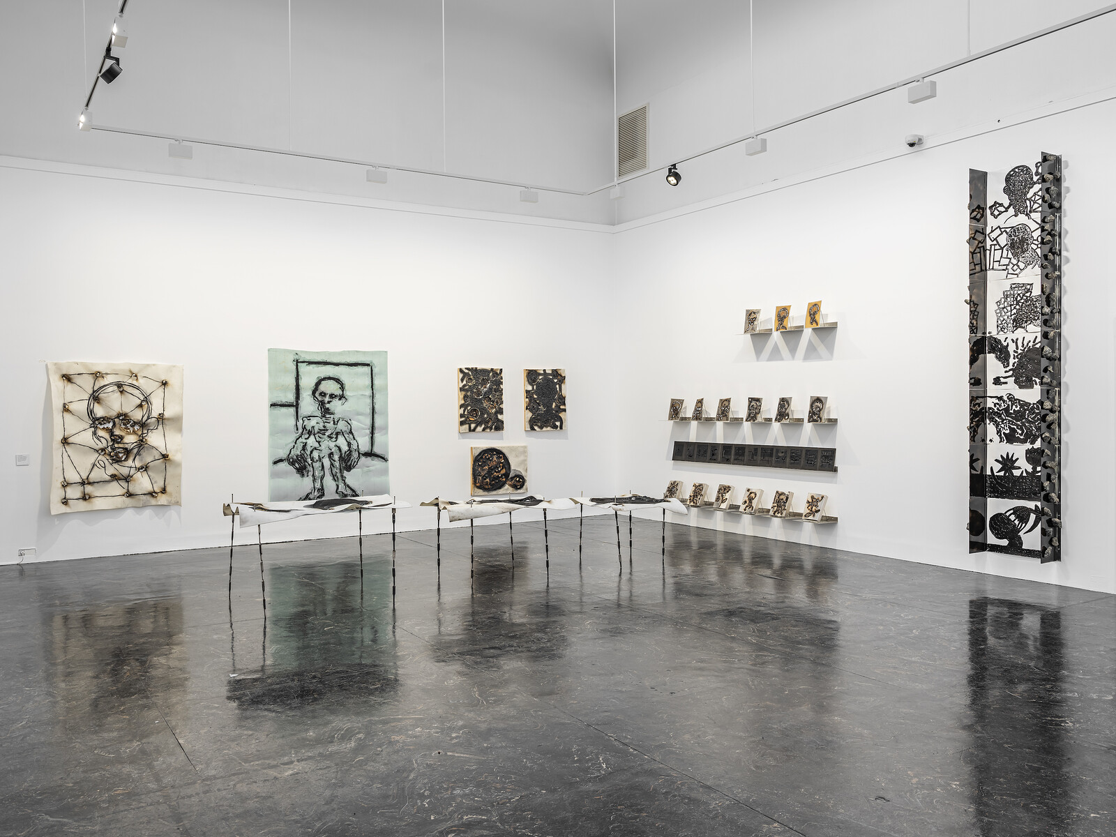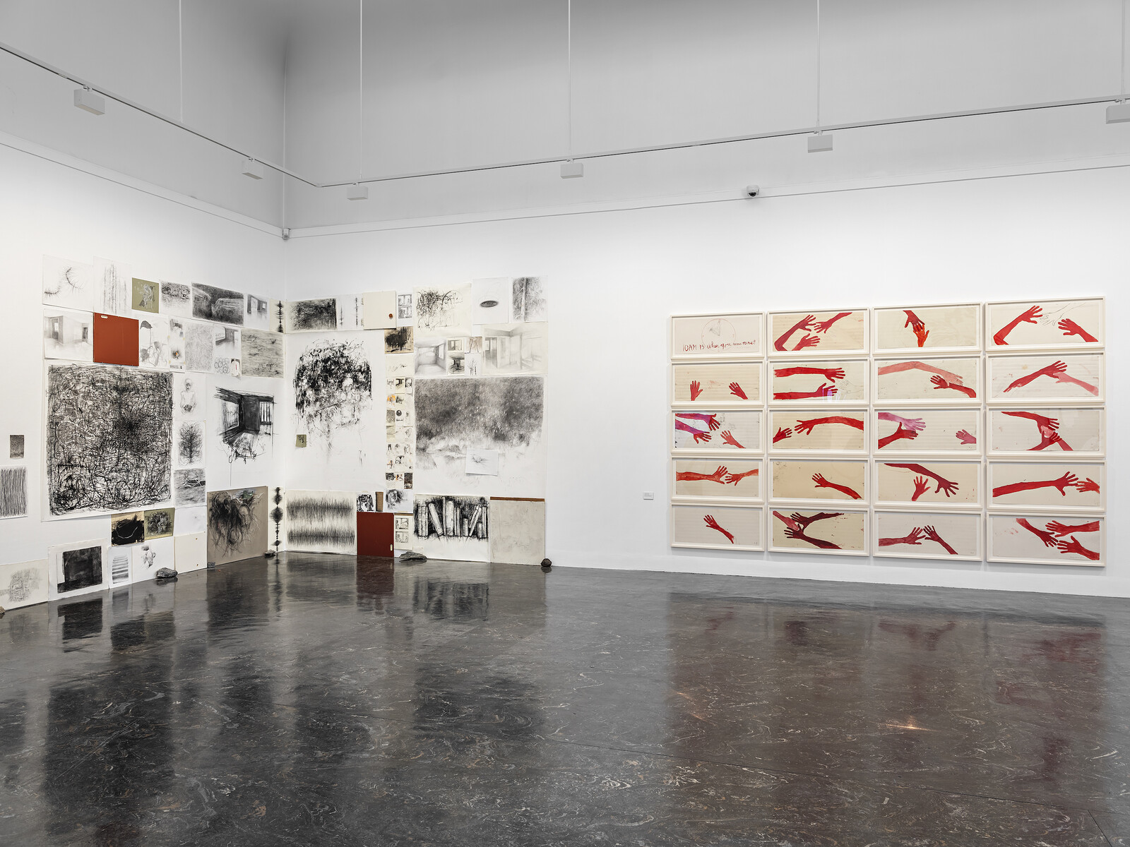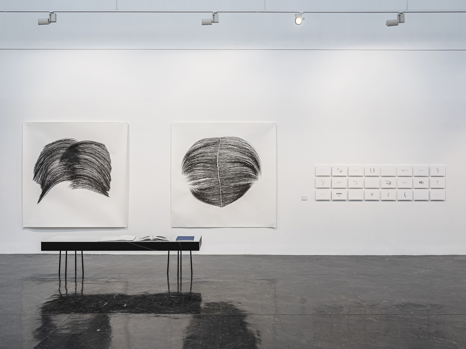 In the exhibition guide, curator Helga-Marie Nordby writes about the recent unearthing of an artefact from the Blombos Cave in South Africa: a 73,000-year-old flake of stone on which a cross-hatched pattern has been drawn in ochre crayon. The triennial describes drawing as a form of mark-making that predates the invention of writing, as an “innate language” and “a potential in human beings in general.”1 While this universalizing claim has a flattening effect on the show as a whole, several individual pieces stand out. Prominent among them are Ana Mendieta’s untitled video performances (1978 and ‘81) from her “Silueta” series, presented on flat-screen monitors. In the performances documented here, the artist digs into the ground, outlines her body’s profile with gunpowder, and ignites it. By burning a representation of herself into the landscape, she suggests a spiritual connection between the human body and the natural world, and the body as a site of trauma. Adjacent to the documentation of Mendieta’s performances is Per Inge Bjørlo’s violent, highly expressive installation - Og såra veks i oss alle [- And the wounds grow in us all] (2019). Bjørlo’s lamenting title points to the technique by which his pieces are conceived, whereby the artist draws on felt, smears the drawings with wax, and sets them alight. The resultant marks resemble gashes torn in the scorched materials. Randi Nygård interprets human emotion more quietly. For her frottages Foreheads (Oskar, Sigmund, Randi, Munan, Thorbjørn) (2014/17), the artist placed paper directly on the foreheads of five models and rubbed the surface with charcoal, adopting a technique that has been used by archaeologists and surrealists alike. Both document and drawing, Foreheads delicately captures time passing on a human scale: worry, joy, confusion, and concentration are evident in her sitters’ expressions.