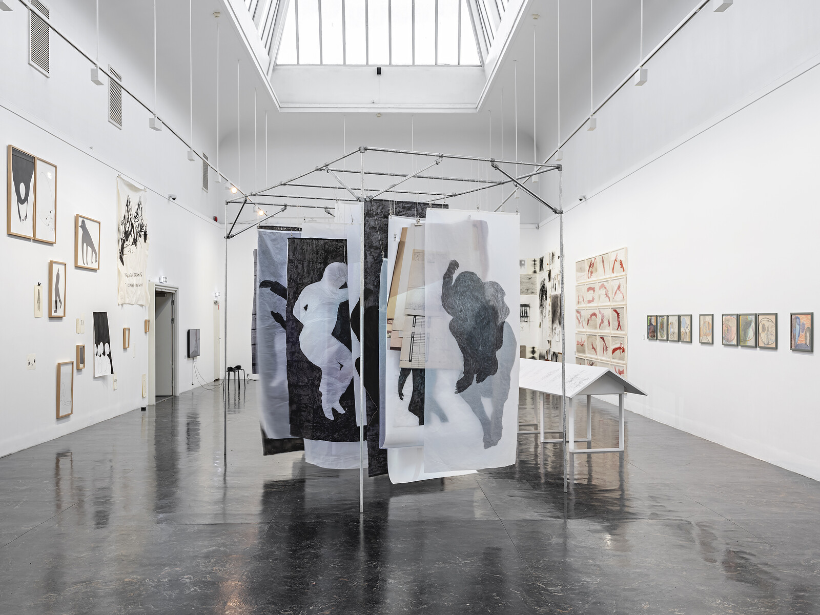 Cecilia Jiménez Ojeda’s enigmatic installation Maria! Por Qué?! [Maria! Why?!] (2019) is an unexpected thrill in this otherwise unsurprising Drawing Triennial. A large china cabinet filled with kitsch figurines is positioned diagonally across a small room. Hidden behind it is the lid of a casket, strewn with withered roses. Every now and then, a nearby stack of neatly folded towels emits clanking noises, which sound like someone angrily washing dishes next door. The hinting at domestic conflict and connotations of death create a sense of unease, counterpointed by touches of absurdity, such as the engraved plaques featuring stage directions for a soap opera, which are mounted to the back of the cabinet. Displayed amongst these are a series of photorealistic drawings of a bundled leather belt, a broken mirror, a disassembled doll, and what appear to be migration papers issued to the artist as a young child. The tension is enhanced by the installation’s secretive quality, and its wavering between being a drama and a farce.