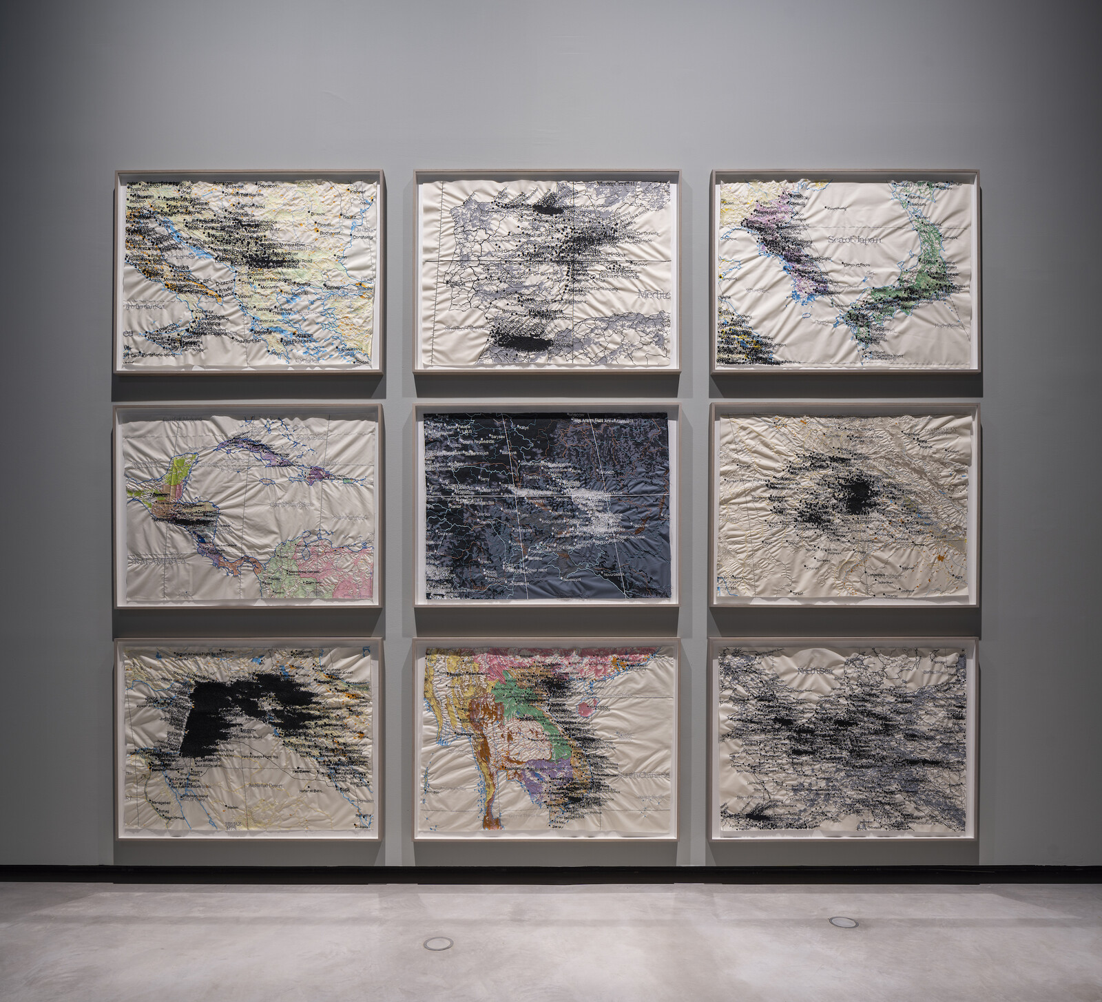 Several works consider the toxic impacts of war on the individual and social body. A vitrine holds fifteen glass slides etched with the flight plans of Israeli jets that invaded Lebanese air space between 2007 and ’22. Lawrence Abu Hamdan collected the data on his website AirPressure.info; placed one atop the other, their incursions appear so dense and frequent that the recognizable form of Lebanon comes to resemble a black lung. Abu Hamdan calls the work a “sonic image,” and its ghostly effect invokes the psychological trauma inflicted by the jets’ sonic booms. Similarly, Cristina Lucas’s “Tufting” (2017–ongoing) features maps of various regions around the world embroidered with the names of sites where civilians have been killed in conflict. Palestine and Lebanon are so thickly threaded that no white linen peeks through their coal-dark surface.