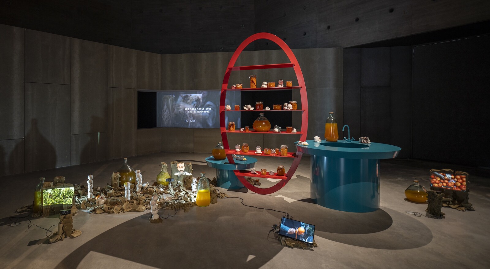 In an adjacent gallery, Mirna Bamieh’s installation Bitter Things: The Kitchen (2024) takes a more expansive approach to the effects of colonialism and ecocide on the food supply. Round, brightly colored kitchen furniture is overladen with jars of hand-squeezed juices and marmalades, all made from bitter oranges. Once the most famous export of the Palestinian port town of Jaffa, since absorbed into Tel Aviv, the oranges are one of several foodstuffs whose production is tightly controlled by the state of Israel, and many are grown in groves confiscated from Palestinian farmers during the Nakba. An accompanying video meditates on the ways that memories—of taste, smell, and family traditions—don’t obey borders. An act of resistance can be as unassuming as a bite from a fruit.