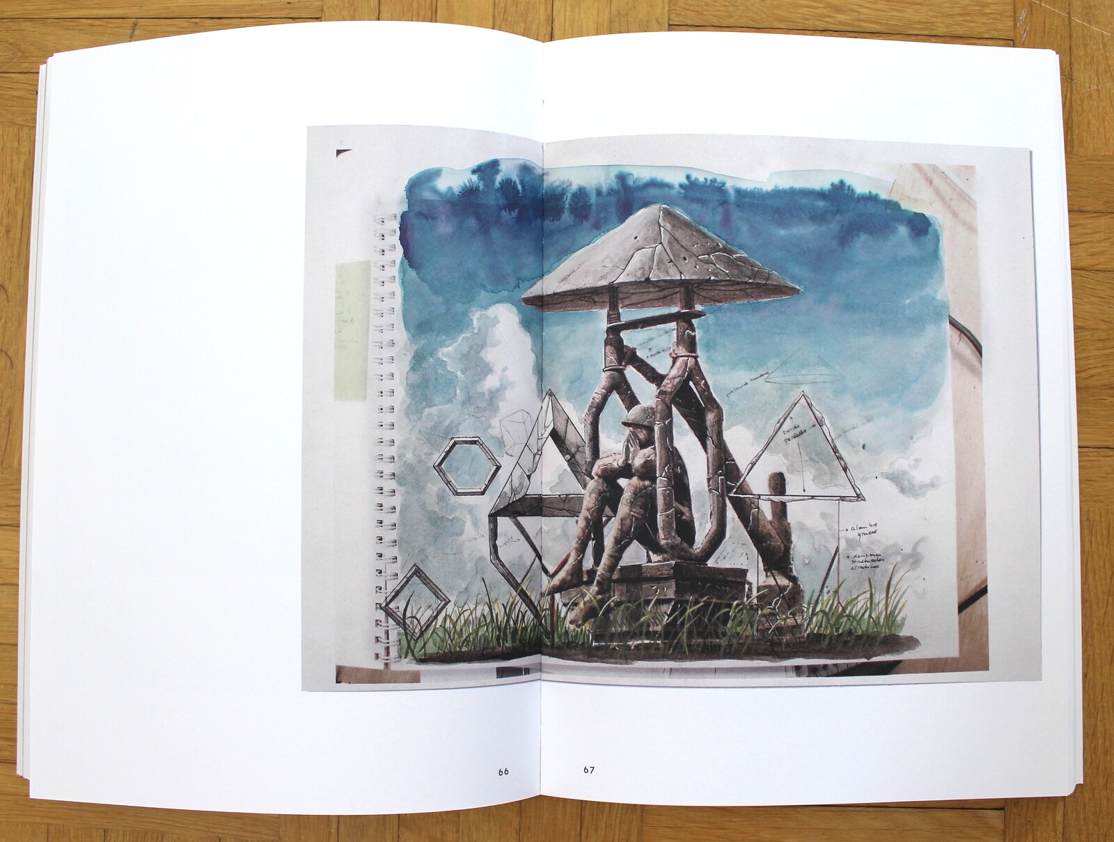 The recent standardization of exhibition catalogs—an introduction, between two and four essays, an interview, pictures of art, a works list—makes more experimental takes all the more refreshing. Andreas Angelidakis’s journal-sized The System of Objects, a 2013 recast of Dakis Joannou’s collection in his Deste Foundation space in Athens, is one example. On each page, a foggy installation shot is superimposed over hazy text from the curator’s “beach copy” of Jean Baudrillard’s eponymous book, like a double-exposed roll of film. Yto Barrada’s staple-bound The Sample Book, accompanying a 2016 exhibition of the same name at Vienna’s Secession, with its embossed, International Klein Blue fabric cover and odd vertical orientation, is another example. Adrián Villar Rojas’s catalog for a 2013 show at Museum Haus Konstruktiv in Zurich shows few of the works on view, preferring to present the drawings that led to them, offering a peek into the artist’s mind and processes.