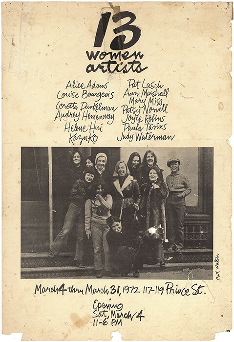 Female artists initiated a series of exhibitions and collective organizations engaged in sustaining and promoting their practices, which found little visibility in galleries and institutions. The exhibition “13 Women Artists,” held in March 1972 in a rented space in SoHo, was one of the first artistic expressions of this new awareness and solidarity. Miyamoto took part in the show alongside Louise Bourgeois, Loretta Dunkelman, Pat Lasch, and Patsy Norvell. The show constituted a kind of incubator for the birth of A.I.R. Gallery, which opened later that year, in September. If Susan Williams and Barbara Zucker were its initiators, they were soon joined by another small group (including Nancy Spero, already part of the above-mentioned Art Workers Coalition). After a careful process of selection, carried out using the slide registry of the Ad Hoc Women’s Artist Committee—an archive initiated in 1970 by Lucy Lippard, which gathered documentation of the work of about 600 women artists—the original nucleus grew to 20 members, including Dunkelman and Norvell. Together, the founding members renovated the first gallery space at 97 Wooster Street and established the gallery’s guiding policies: A.I.R. had no director and no leader; each member had a part in collective decision-making in monthly meetings; each artist had to contribute a certain amount of their own money and collaborate on the practical aspects of the organization and maintenance of the gallery. In return, members had the right to have a solo exhibition every two years, in which they had total autonomy. The entire profit of each sold work went to the artist, thus bypassing the usual 50 percent commission to the dealer.