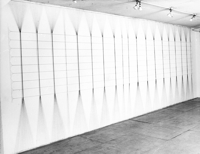 Lawrence Alloway, “Kazuko,” in Kazuko Miyamoto (Berlin: Exile Berlin, 2013), 14. Originally published on the occasion of Miyamoto’s solo exhibition at Ginza Kaigakan Gallery, Tokyo, 1977. It must be noted that Sol LeWitt’s Wall Drawing #815 (1997) is constructed upon a system of strings nailed to the wall, in what can be read as an homage to Miyamoto’s art.