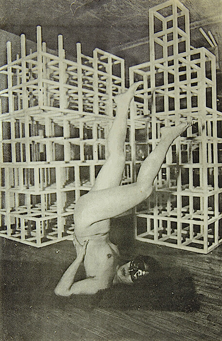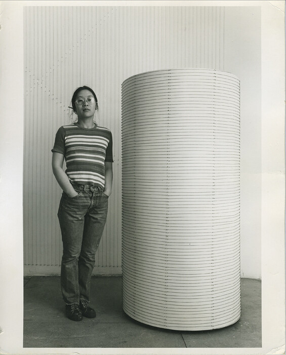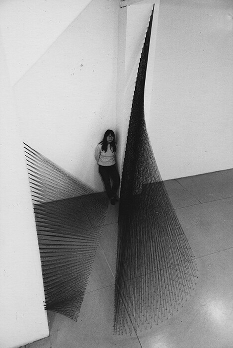 Different “String Constructions” were presented at A.I.R. Gallery on a number of occasions between 1975 and 1983. In her 1979 show, Miyamoto invited the experimental dancer Yoshiko Chuma to relate to her work and perform around her installations, thus demonstrating the crucial role played by the body in conceiving these works and in Miyamoto’s overall practice.5 This relation to the body was already evident in her previous solo show at A.I.R. (1977), where she built up two cylinders that measured the exact height of her and her then-partner’s body, covering them with a pattern of strings and nails, thus giving the Minimalist shape a personal, even intimate character.6