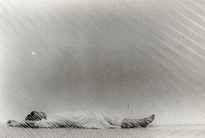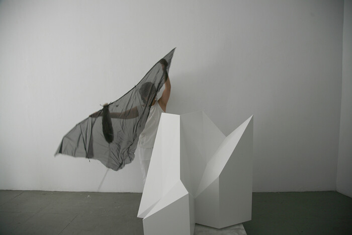 From Miyamoto’s early Minimalist-oriented pieces of 1970s to her photographic works of the 1980s and 1990s, from the sculptures and installations to the various performative activities, the role of the body in Miyamoto’s work became progressively prominent through the years. From the early 1980s, Miyamoto engaged her own body as well as those of other women in a number of actions and performances in private and public contexts. More recently, and with reference to traditional Japanese forms of theater and dance, she worked on a series of performances that have a ritualistic character and often use kimonos as props or instruments. An example is Improvisation on a Black Bird (2014), shown at Palazzo Collicola Arti Visive in Spoleto and later at Museo D’arte Orientale Giuseppe Tucci in Rome, both as part of the exhibition “The Pink Gaze.” On the first occasion, works by Sol Lewitt functioned as the background or elements of the staging. In this and other actions Miyamoto interacts and, at times, guides the movements of a second performer, which she relates to the work of traditional Bunraku puppeteers. I curated the exhibition “Kazuko Miyamoto. Bodily Tactics,” dealing with the role of the body in Miyamoto’s practice, at The Japan Foundation, New Delhi, January 23–February 28, 2015.