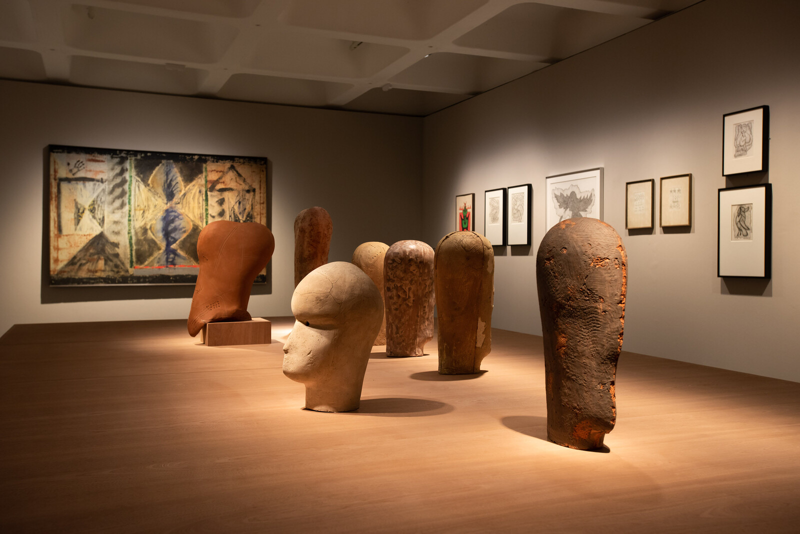 If Indian artists have always been considered “cosmopolitan,” it’s perhaps because we tend to think of their migration outside of India towards Europe and the Americas: Bengali poet Rabindranath Tagore reading law in London in the 1870s, or the world citizenship of Vikram Seth.2 The significance of an individual artwork or single art career when cast against the broader history of India can be fickle. Looking at “The Imaginary Institution of India,” I was propelled to consider the migrations and movements of artists within India itself: the circulation across time and place of artists, their works, and their ideas. For example, what is the link between the Indian Radical Painters’ and Sculptors’ Association in Baroda and Kerala? One of its members, K. P. Krishnakumar, was born in Kerala in 1958, and lived and worked in Baroda during the 1980s. The exhibition guidebook states that the Radical Group disbanded after his death in 1989, yet posthumously, his stature has increased across the country: Krishnakumar’s monumental sculpture was displayed at the inaugural Kochi Biennale in 2012, while his artwork is now in the permanent collection of the Kiran Nadar Museum, a major partner of the exhibition, in New Delhi.3