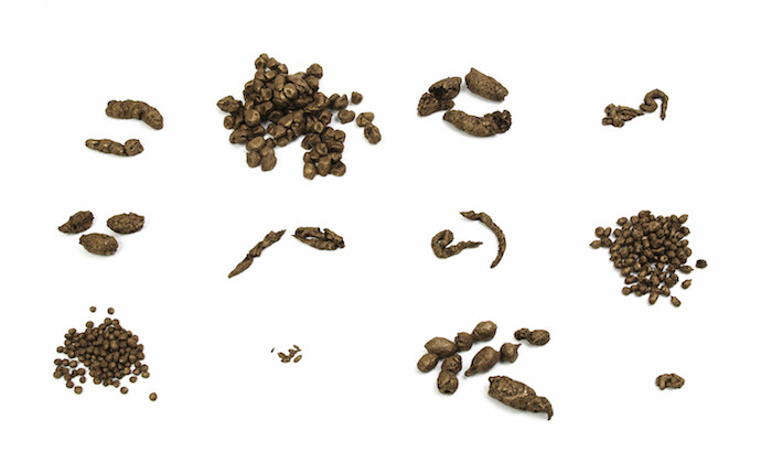 Weighting the pages open and obscuring some of the text is a pair of slender turds made from gleaming bronze. It’s unclear exactly what creature might have left them—my guess is a pine marten. They’re from “British Mammal Shits” (2012), Marcus Coates’s series of bronze casts of the droppings of foxes, otters, hedgehogs, and other animals. If Twain is emphasizing a shared humanity against the differences accentuated by the rising nationalism of the late nineteenth century, then Coates—with a sense of absurdity characteristic to his work—seems to be drawing analogies between human divisions and those of other mammals. After all, humans are not the only animals to display regional variations or engage in territorial disputes.