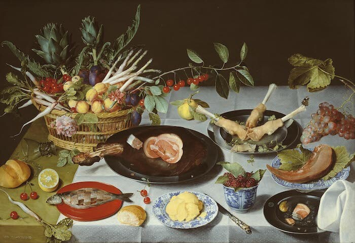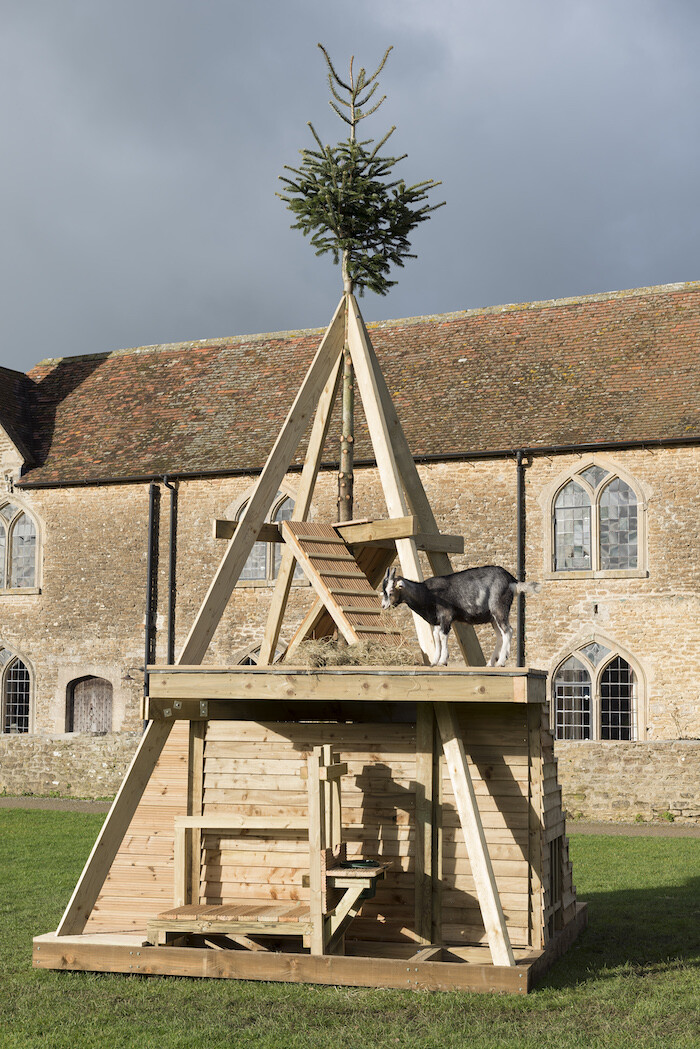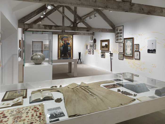 The exhibition, and its detailed accompanying booklet, features over 200 works. Live projects involve cheesemaking, aquaponics, and a goat pavilion. Arranged on the walls are William Blake etchings, a John Ruskin self-portrait, four faces by Giuseppe Arcimboldo, and the lavish Still Life of a laid Table, with Plates of Meat and Fish and a Basket of Fruit and Vegetables by Jacob van Hulsdonck painted circa 1615, a period when huge value was placed on produce, if not the labor that produced it. Also on display are books and ceramics, pamphlets and postcards, quilts and banners, a tea towel, a copper tray, even an old smock in a vitrine. (This latter work could be read as a metonym for Hauser & Wirth Somerset itself, in which a series of old, functional farm buildings are placed in a new aesthetic context.) Many pieces come from Grizedale’s own collection; others are on loan from many different sources. A map of the farm roots the exhibition locally, while works from Italy, Japan, and Poland gesture toward an international outlook. Kate Greenaway’s watercolor, Study for Rock, Moss and Ivy (1885), is a particular highlight: not just a portrait of a rock that Ruskin gave her, but its own world within a world, an entire landscape of grays and green.