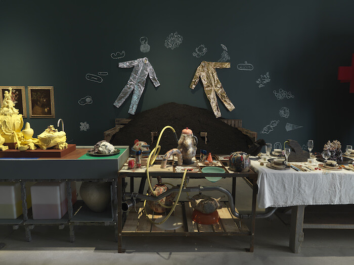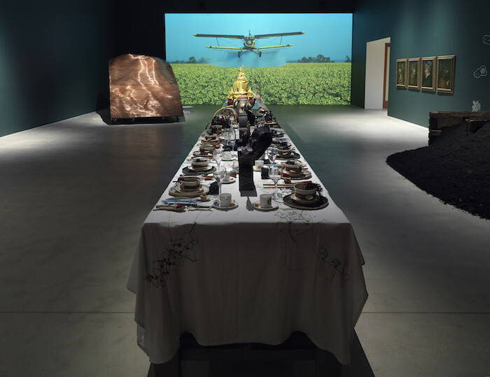 It’s unclear why these little turds have been placed atop Twain’s book. Maybe it’s simply a pun on the references in the novel to “bottom” and “force it out.” It is one of many moments of potentially productive confusion that recur throughout “The Land We Live In – The Land We Left Behind,” curated by Adam Sutherland, director of Grizedale Arts, an organization in the Lake District that champions art as a tool for social change. The exuberance and length of the title—an old migrant workers’ toast—sets the tone for a survey exhibition that explores “the contradictory nature of society’s relationship to the rural.” Sprawling across five gallery spaces and out into the courtyard and grounds, it is at once joyous and overwhelming.