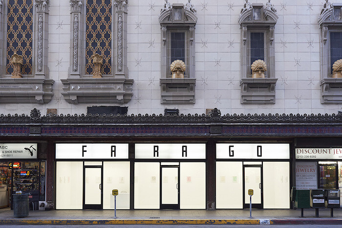 Conversely, apparently taking a lead from Kiesler’s writings on the possibility for a building’s façade operating 24 hours per day, Los Angeles’s Farago gallery has been staging exhibitions to Downtown’s pedestrian shopping traffic day and night since opening in three former jewelry stores on West 8th Street in 2014. Because of the shallowness of the three adjacent glass-fronted shopfronts, works remain visible and well-lit around the clock. During William Crawford’s exhibition “More Worried than a Worm in a Bird’s Nest” in early 2016, the subtle dissonance between the gallery and its surroundings was amplified by the elegant display of pornographic drawings, just legible from the sidewalk.