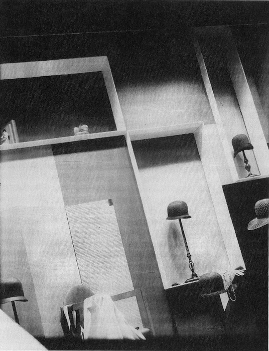 The challenge of performative facades and a new, transparent architecture that theatricalized both goods and customers (and the new form of publicness it gave rise to) appears to have caught the imagination of artists from the second decade of the twentieth century: Surrealists extending their visual contextualization of publications from their jackets to the windows that displayed them (from René Magritte’s 1934 cover designs for André Breton(4) to Marcel Duchamp’s 1945 window display for Brentano’s bookstore in New York, again for a publication by Breton); the Futurists championing the consolidated display of industrially manufactured artifacts (Giacomo Balla’s attitude was not atypical—Fernand Léger was to celebrate the elaborately composed artifact’s “inutility” in this context in his “Notes on Contemporary Plastic Life” of 1923); and the Constructivists’ and the Bauhaus’s willing fluidity between “fine art” and industrial design (Aleksandr Rodchenko and Vladimir Mayakovsky’s agency Reklam-Konstuctor [Advertising-constructor], for example).