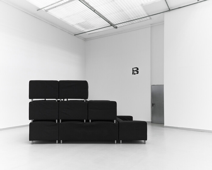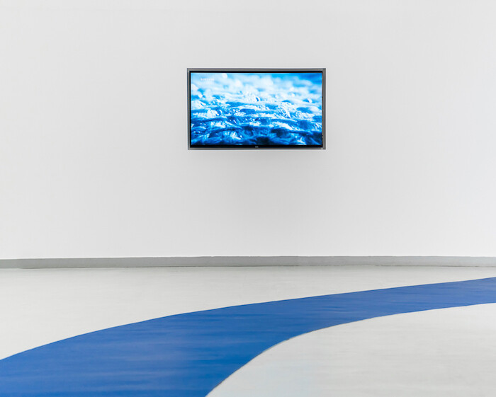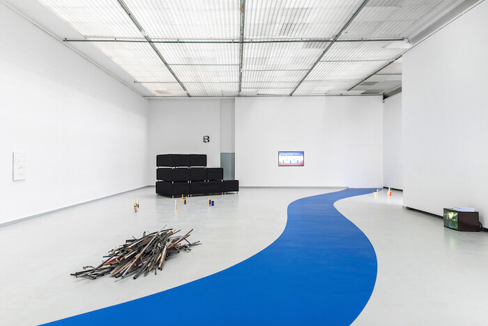 Martin Ebner’s architecture for the show, a blue curvy path wriggling throughout the floor, functions as a visible trajectory (of a teenage bee maybe?) or as an ocean stream affecting and connecting the works placed around it like islands. Some works-islands are related to others, others less so. Anna-Sophie Berger’s large-scale sculpture Lion’s Fate (2018), comprised of a group of IKEA sofas borrowed from the Contemporary Art Centre’s cinema hall, refers to an unbuilt monument for German World War I soldiers buried in Vilnius. This gesture of relocation and re-contextualizing is not directly related to the economy as the other works on view, and thus it stands out—both visually and conceptually. A similarly lonely island is the short video Days of Vision (2018) by Liudvikas Buklys, a mix of found YouTube clips of a group of teenagers walking around parks and fields and talking about trees and plants in a tone mimicking nature documentaries. Their crude filming, with aggressive zooming in and out, and random choices of objects to film—such as tree trunks or leafless branches—create almost uncanny, abstracted graphics. Here, the removal of the footage from its original context generates a more enigmatic and aesthetic experience than the literal market-related references found in the other works in the exhibition.