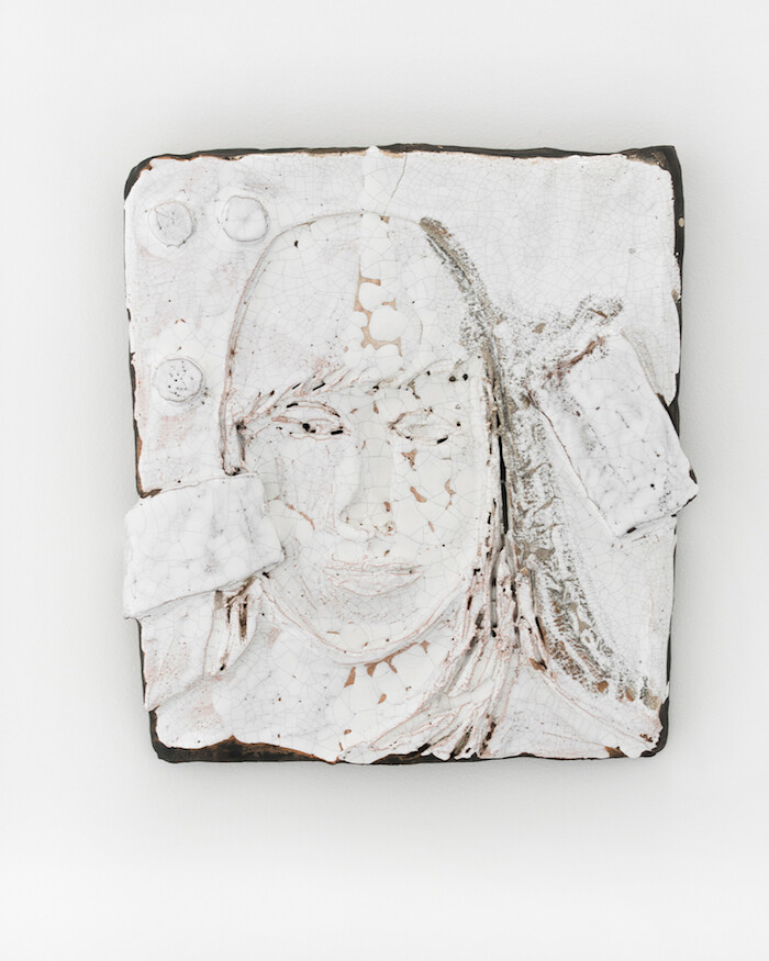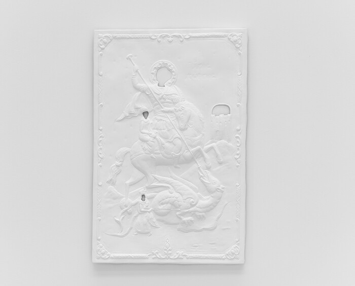 The exhibition struggles to grasp the slippery status of art today, lingering between autonomy and subsumption in the market, by focusing both on how artists operate within the realm of abstracted signs and how they attempt to break existing codes by displacing objects or symbols from their original context. The latter is a Duchampian strategy that is widely employed in contemporary art, but the works in the exhibition build on it, turning to market schemes to explore the transformation of concrete physical things into abstraction, and their further multiplication, circulation, and revaluation. Displayed as a series on the entrance wall are Michaela Meise’s “Money Faces” (2012): a group of small glazed ceramic reliefs naively depicting human faces surrounded by abstracted coins and notes. Multiplied and circulating, like portraits printed on banknotes, the work doubles the anonymity of the represented people, converting them into abstract currency. Another face appears, and is then erased, in Gaylen Gerber’s undated painting Support. Painting in white paint over a nineteenth-century Russian icon depicting Saint George slaying the dragon, Gerber leaves only a silhouette visible. The original value of a widely worshiped figure and the physical icon itself is muted, thus reiterating the logic of the market: the underlying object, the support, is no longer important in the speedy exchange of abstracted values.