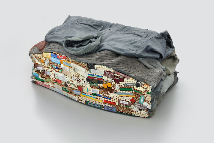 According to writer and critic Gotthold Ephraim Lessing’s theory of sculpture, one may read the pose of a figure always as a transitional moment in a movement. There is something pre-filmic in this theory, which he developed in his essay “Lacoön.”1 I can imagine a scene in which these clothes were handed to a rough sleeper at a charity. Shabby though they are, they’re still properly washed, then well folded, and handed out to someone, who took the pile and placed it next to his sleeping bag in a walkthrough. Then he used the clothes to hide another stack, one of cigarettes. The backside of the sculpture reveals that the clothes are covering a huge stack of cigarettes, and open cigarette packages. There are too many to be smoked by just one person. That means these cigarettes are meant to be distributed or to be given away or they are the result of some game of circulation. Given the fact that they’re all different brands of cigarettes, they may not come from the same source. They must have been collected. In this world, I cannot imagine a person who would collect such a variety of cigarettes. For that matter it falls on the observer, or should I say discoverer, to explore another world. A world in which this assemblage makes sense.