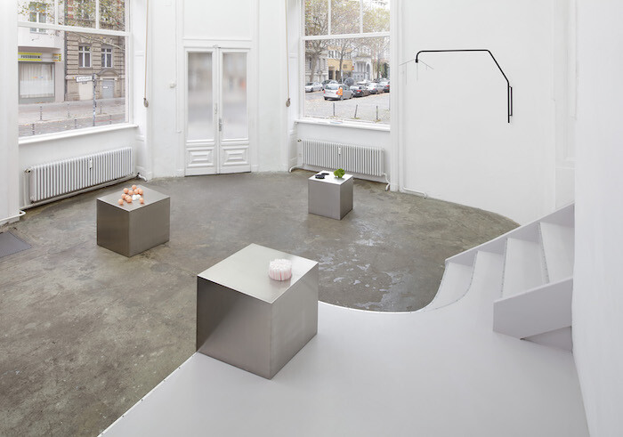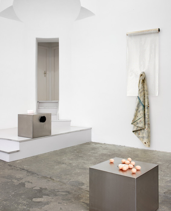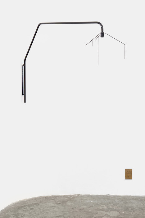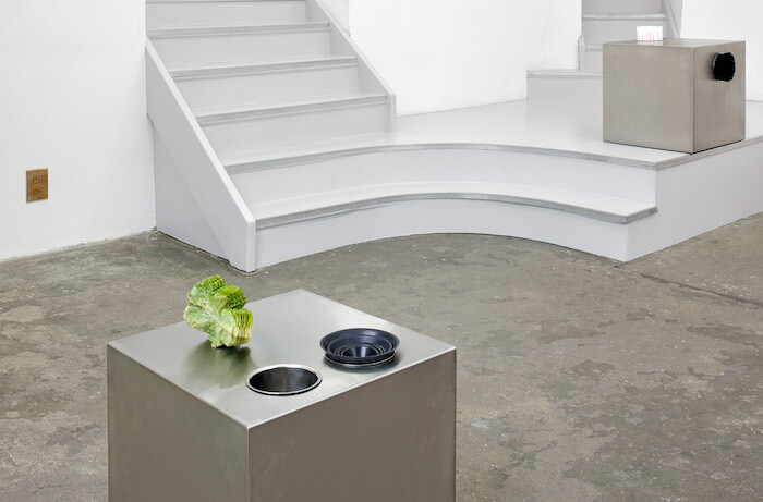 The second series, installed in the first room of the gallery, consists of three steel boxes, also by Gabriel Kuri—box for sort, box for stand, and box for and with (all 2017). They look like an interconnected system of distribution, associated with food. There are eggs, plates, salad leaves, straws, and a rotary brush-like tool. The longer I looked at these attachments, the more they looked like mere signs. Not like the real thing. As if these extensions are only there to make the metal blocks seem utilitarian.