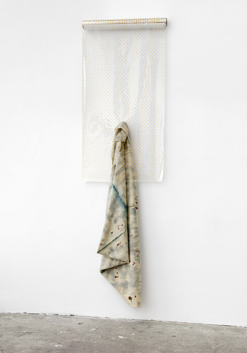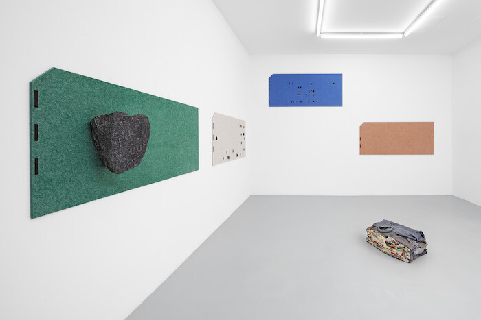 There are two or three other spaces of economic circulation in the show. First, next to Magor’s work, is a series of four oversized data cards, wrapped in colored felt by Gabriel Kuri: felt data card (2017). One carries a black stone, approximately the size of a human head. Two have shells stuck to the felt in patterns reminiscent of holes in a punchcard. One remains empty. We may read this series as a typology of money, with stones as tokens, like in Micronesia; shells that used to circulate as currency in many coastal places; and a void as in the space to write an IOU—as in our current form of money.