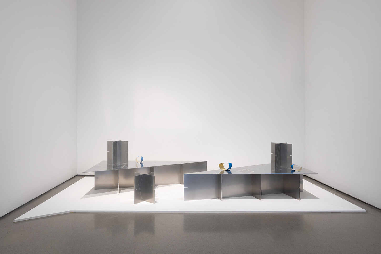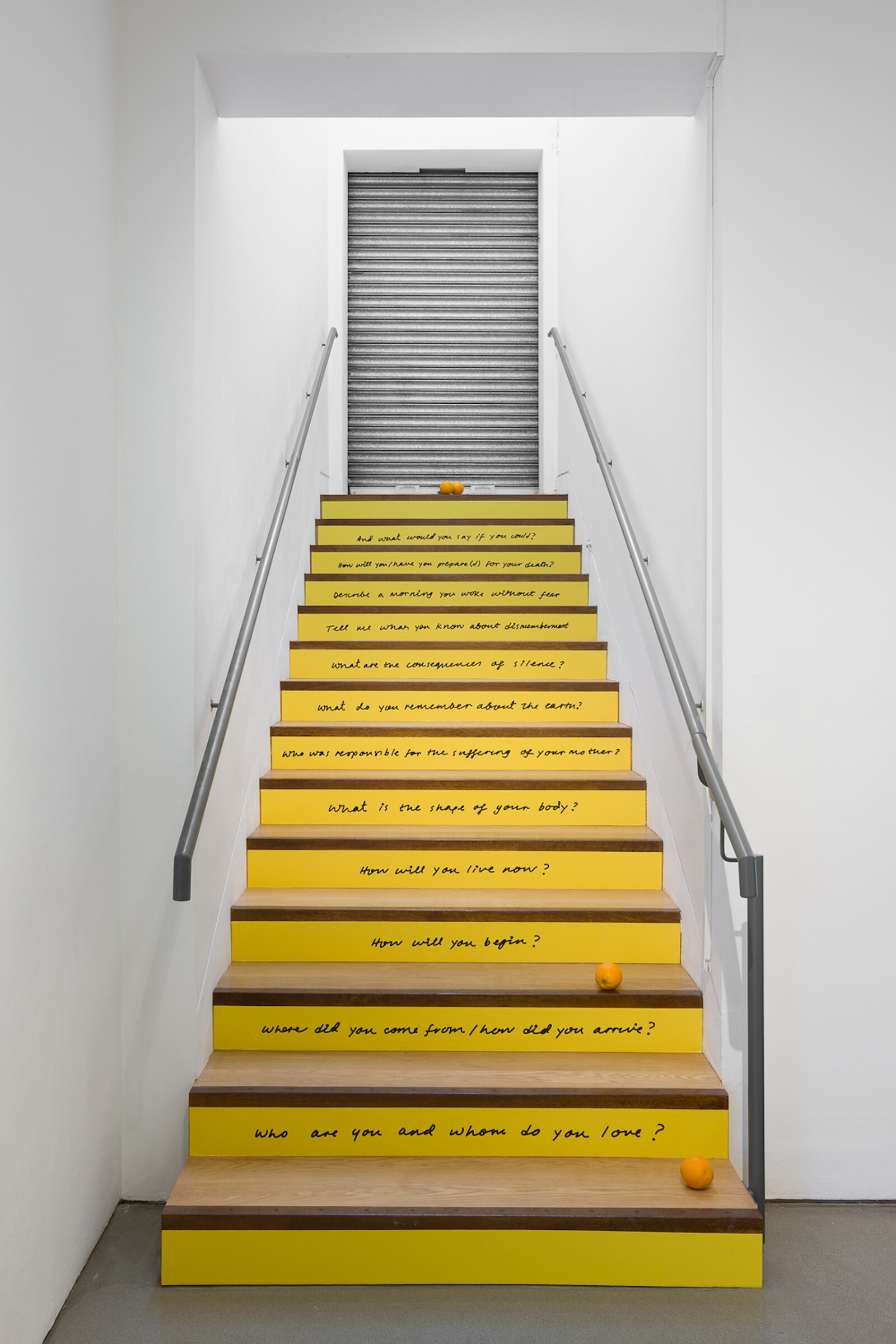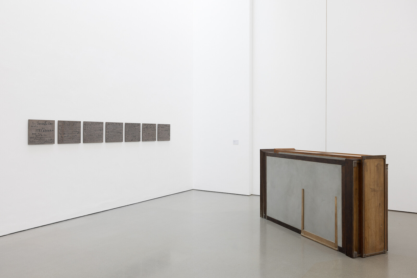 The curators, Clare O’Dowd and Nick Thurston, argue that the works on display represent the meeting of two traditions that have been artificially separated and codified. Sculpture and poetry are taught and interpreted as distinct disciplines, when they are in fact intimately connected by purpose and technique. Several of the artists here point to literature in their work: Joo Yeon Park’s kit-like engraved aluminum is a fragment of potentially infinite architecture such as that imagined in Jorge Luis Borges’s “The Library of Babel” (1941); a commissioned text by poet Anthony (Vahni) Capildeo, swimming amongst fish in a blue vinyl mural on the gallery’s front wall, quotes Simone Weil; Doris Salcedo’s monumental Untitled (2008), made of used wooden furniture and concrete, references Paul Celan. But strikingly, as a whole the show moves beyond the more familiar processes of disciplinary exchange often grouped under the fashionable umbrella of ekphrasis.