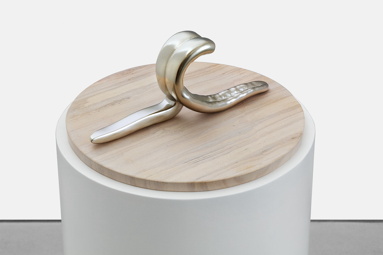 The gallery doors are papered with “notional newspapers” made by Mark Manders, their nonsense news illustrated by images of miscellaneous debris, recalling Man Ray’s photograph Dust Breeding (1920), taken in Duchamp’s studio. Manders intends the exhaustive project to use every word in the English language, in what could be an ironic riff on Ezra Pound’s definition of poetry as “news that stays news.” The nearby Standing Heech (2007) by Parviz Tanavoli has a contrasting impulse: to make something from nothing. “Heech” means “nothing” in Farsi, and the pert, avian-green sculpture resembles the Persian letters which make up the word. It’s a simple gesture, the liveliness of the form working against the signifier out of which it has grown, and the dynamic is beautifully caught. Stepping back, I almost fell into Untitled (Cornucopia) (2019) by Leslie Hewitt, propped against the wall. The photograph is a still-life arrangement of books, acting as a plinth for a block of wood. Like the works around it, the restrained, precise piece invites an uncertain combination of looking and reading, not unlike the halting process of learning a language.