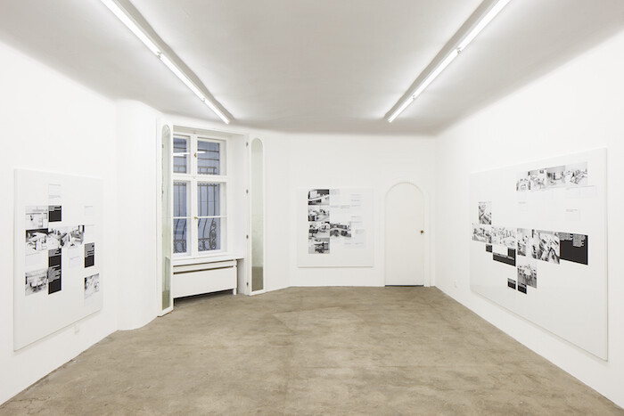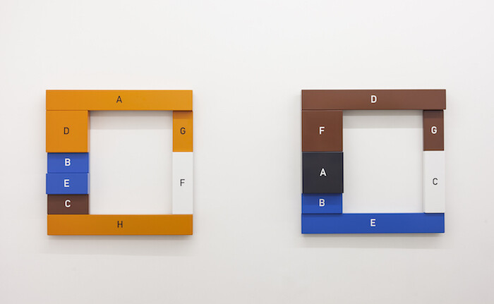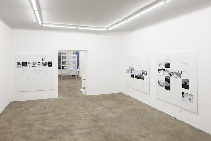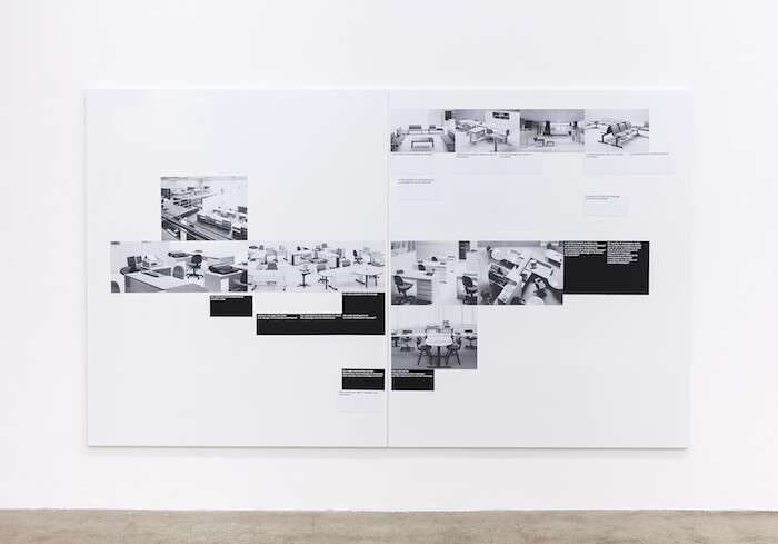 In Politics of Communication, corporate space appears to be fully determined by these rigidly choreographed communication protocols. Most of the text captions are descriptive rather than prescriptive, but even as descriptions, they seem to fit the operations of a recursive algorithm rather than those of a human society, where the determining factors of structure formation are hardly internal to the structures themselves. This programmatic character is echoed by another series on display in the gallery’s front room, A–G and A–H (2002-15), two frames mimicking floor plans, and by A.1—Z.2 (1989), a large-scale spreadsheet with all the information blanked out. Locher’s artistic career—which spans several decades—can perhaps be best described as an attempt to de-naturalize meaning. His work is methodical and analytic (rare qualities, at present, when most artists tend to pictorialize everything). Forcing the viewer to undergo a deadening process of redundancy and repetition, the artist points to the slippage between “coercion from within” and “coercion from without” in the rhetorics of management—whose purpose as a social technology, as Locher makes increasingly apparent, is to strengthen integration and to implement corporate discipline rather than to convey information or promote communicational exchange.
