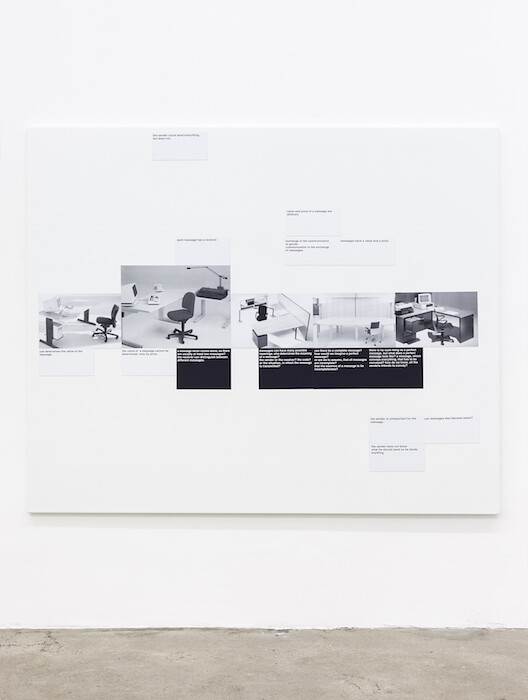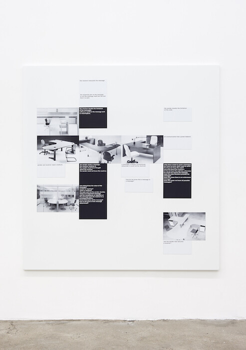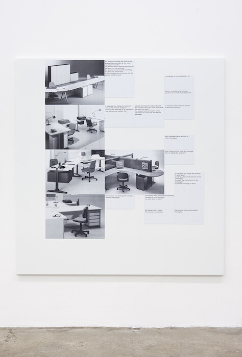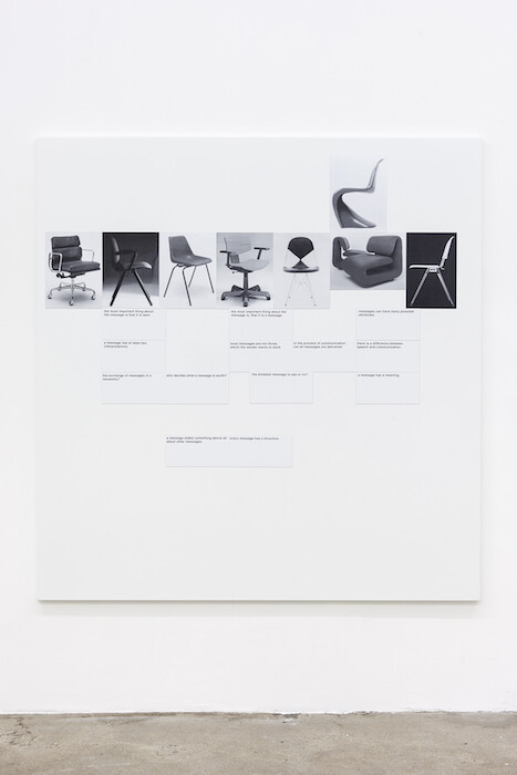 In “Post-Information,” the display mirrors the subject matter: the exhibition spans two soberly staged rooms, which are metaphorically sealed off by the strategic positioning of an aluminium, shelf-like sculpture, Gestell (1990), obstructing the gallery’s entrance/exit. The series “Politics of Communication” (2000), shown in the second room of the gallery, consists of five large-scale composites of image and text. The pictures are of office furniture ranging from sleek to functional—at times as individual items (office chairs), at times as complete ensembles (workstations, conference rooms, storage systems). Each grouping is accompanied by text captions, which either describe or examine the tenets of communication theory: the nature of information, message, code, medium, and meaning. Information is technical in nature. Strictly speaking, you cannot interpret information; you can only decode it. Within the rubric of information theory, an exchange lasts only as long as is necessary for the information to come through, from sender to receiver. Once both parties believe the message has been successfully transmitted, communication will typically end. To make use of Locher’s example (as mentioned in the press release):