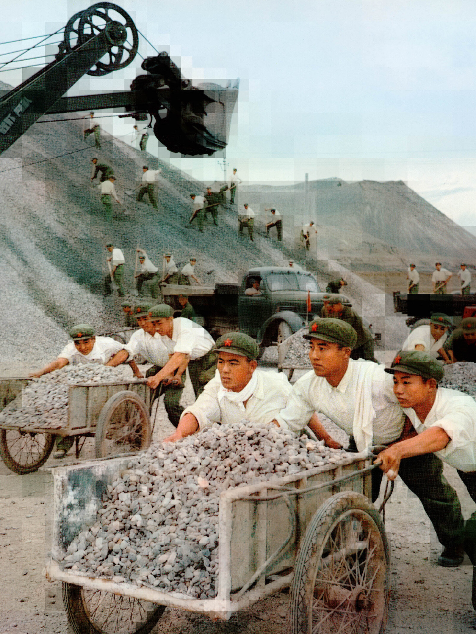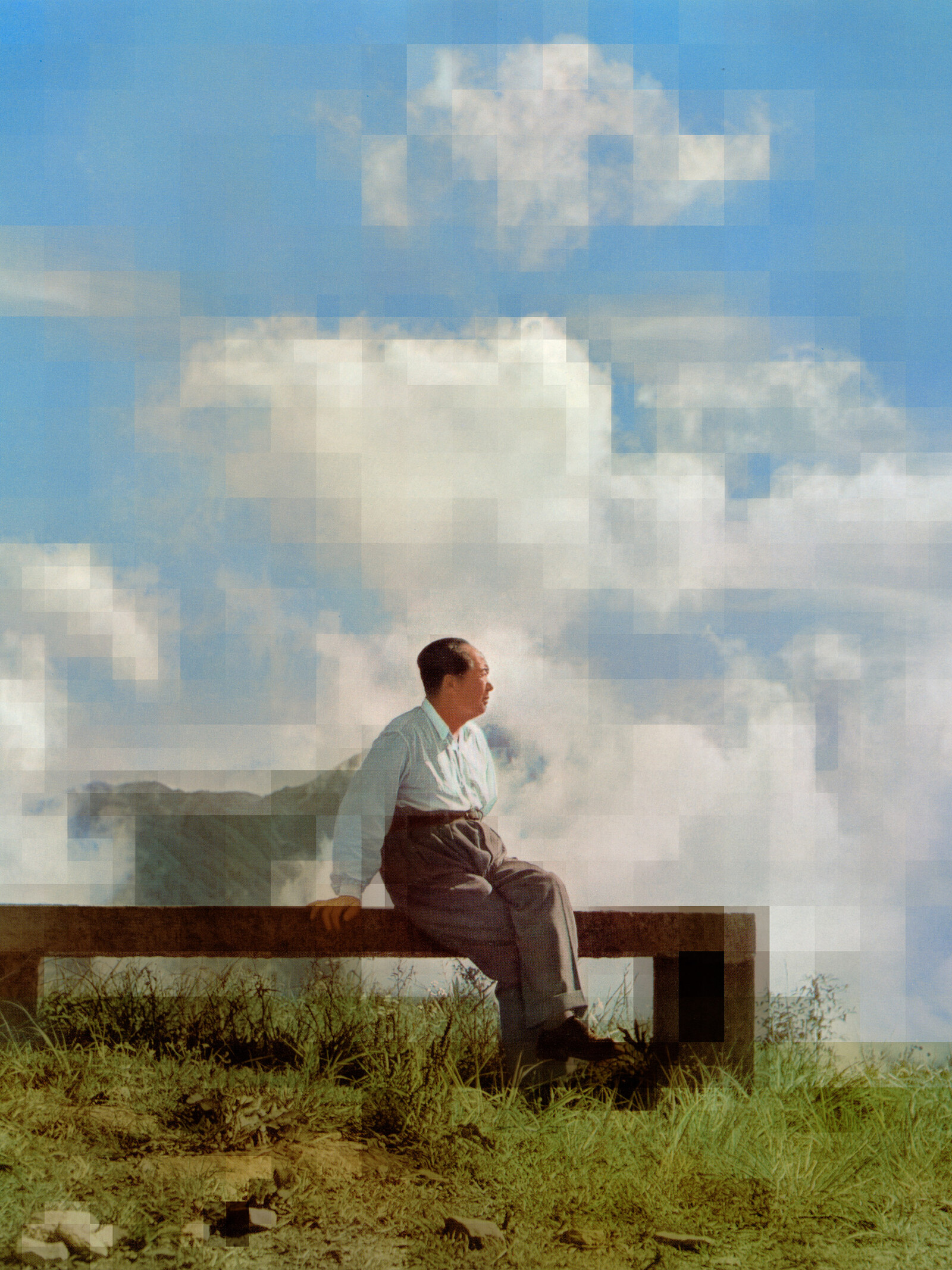 Here, Ruff has scanned propaganda images taken from the Chinese-produced European magazine La Chine, published between the 1950s and ’70s, and converted the analog halftone pattern of the scans into a pixel structure. He has then placed the digitally built images over the scan of the original. The pixel structure is clearly visible as large blurry squares which stack together to form larger squares. In some areas, he has removed the digital layers, leaving the original halftone pattern intact. Ruff’s technical interventions introduce an additional movement between clarity and distortion into these dramatic images, with the eye seeking out a stable fact on which to rest amidst the stretching of the truth.