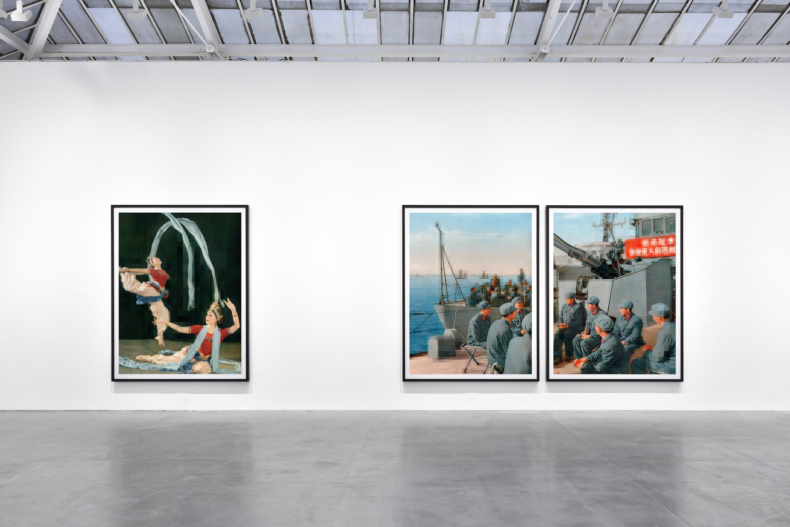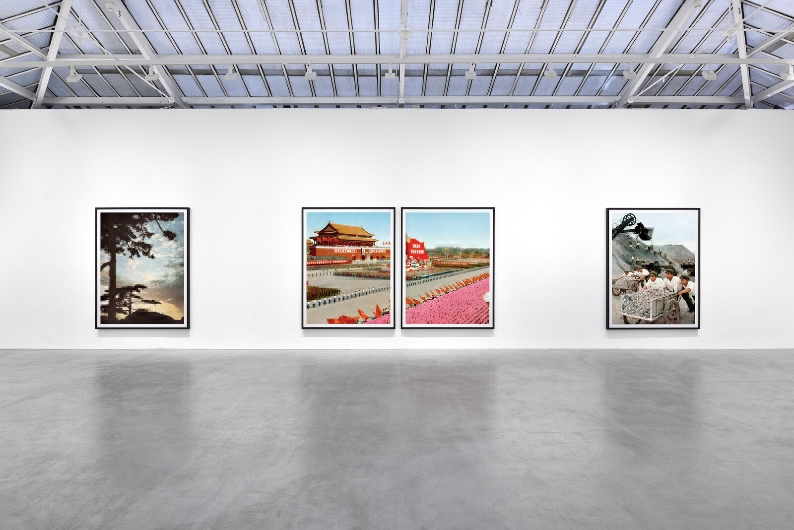 In layering the digital over the analog, Ruff gestures to the separation between the propaganda image and reality. But the more interesting cleavage is between the lustrous authority of agitprop and the technical neutrality of its production, the pragmatism and detachment of Ruff’s own practice. On this path, Warhol is a guiding light. Indeed, a floral still life (tableau chinois_10, 2019) hangs on the central wall beside a portrait of the Chairman (tableau chinois_09, 2019).