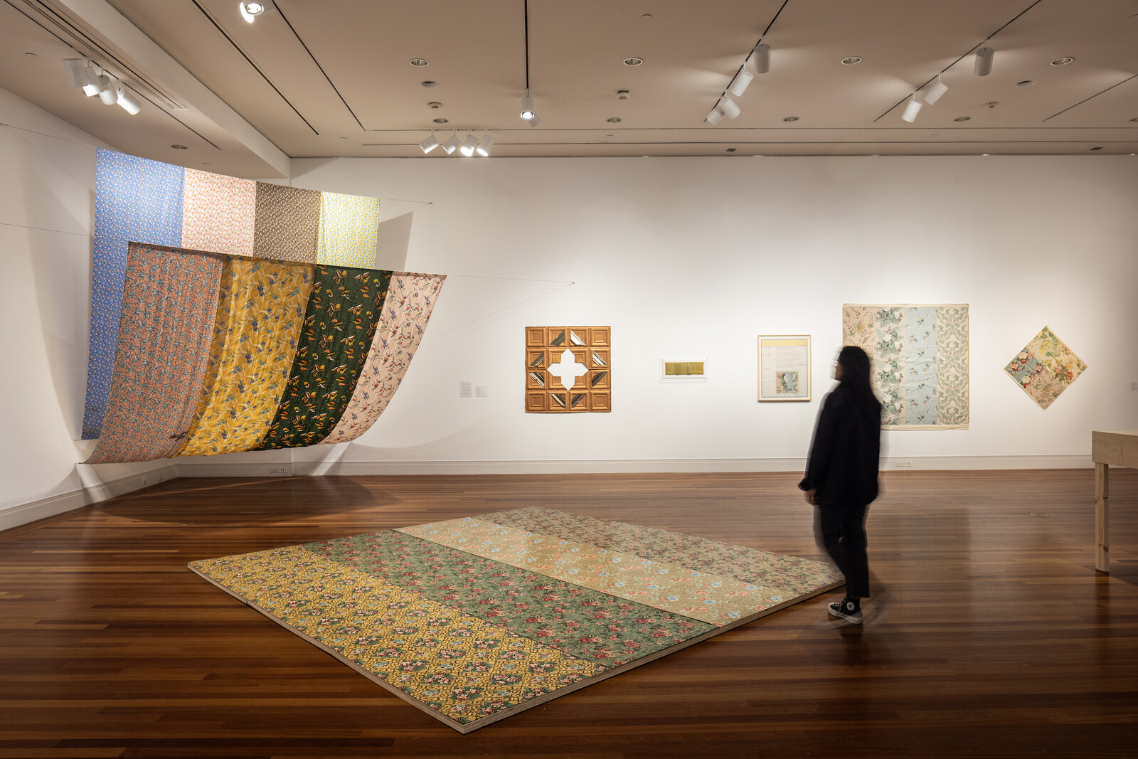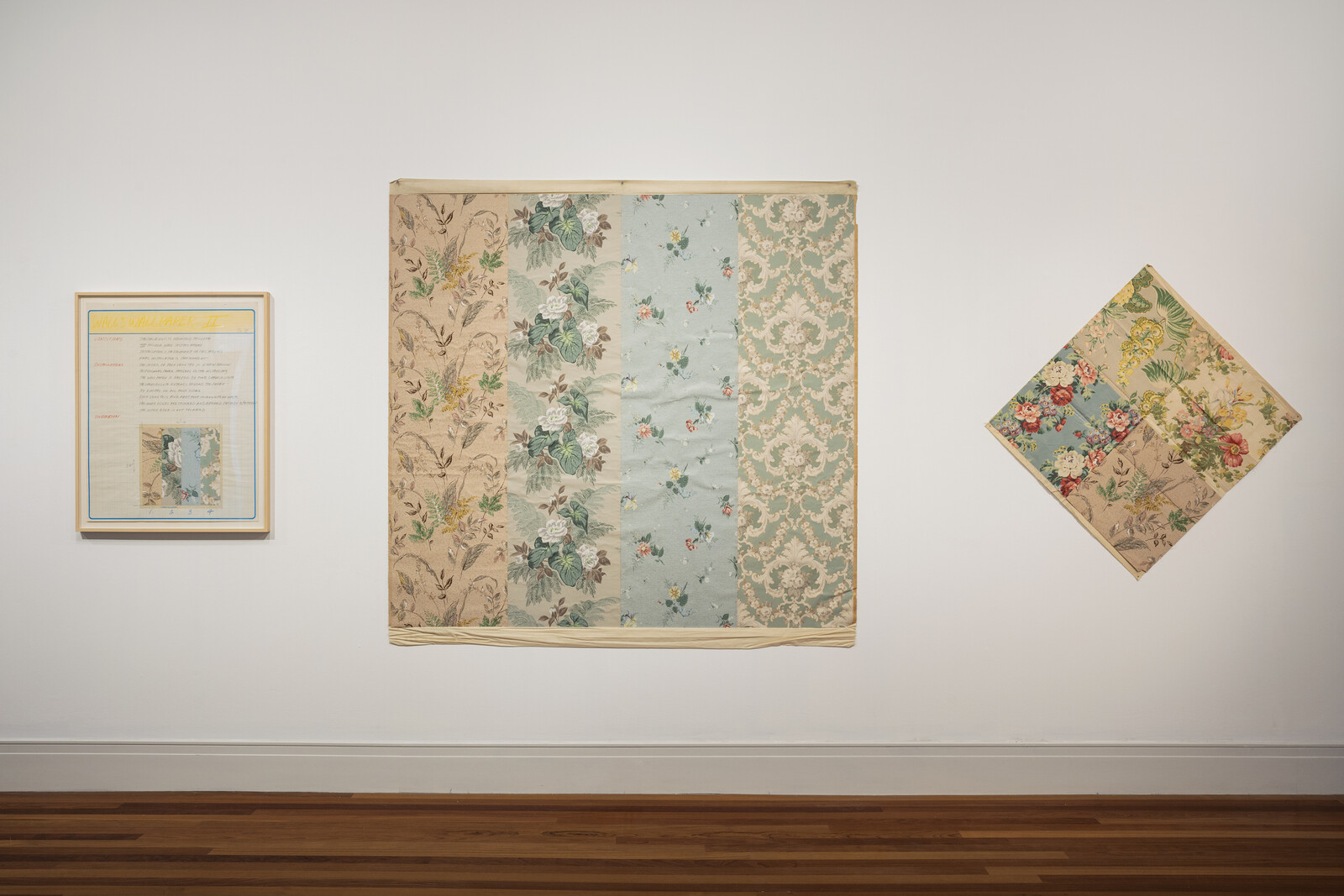 Girouard’s conscientious handling of these fabrics, informed by her work at the vanguard of the Pattern and Decoration Movement, was at once infused with the ritual motions of domestic labor and with a treatment of the “Lots” as bodies to be cared for. As well as the “Lots,” human players circulated in and out from piece to piece, in keeping with Girouard’s notion of hospitality.2 The “Solomon’s Lot” textiles were given a “grand finale” in Pinwheel, performed at the New Orleans Museum of Art in 1977, before being officially retired. For Pinwheel, Girouard and three other performers placed the silk strips in a cruciform, which they then proceeded to embellish over the course of the hourlong performance as an overhead camera looked on and recorded. Here at the Ogden, this footage is projected onto the floor of the smaller gallery, with chairs upholstered with patterned textiles creating an intimate gathering space around the projection.