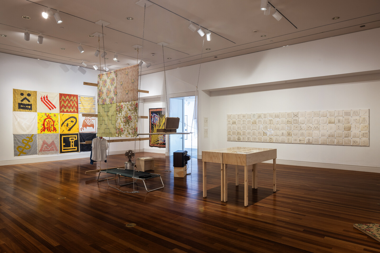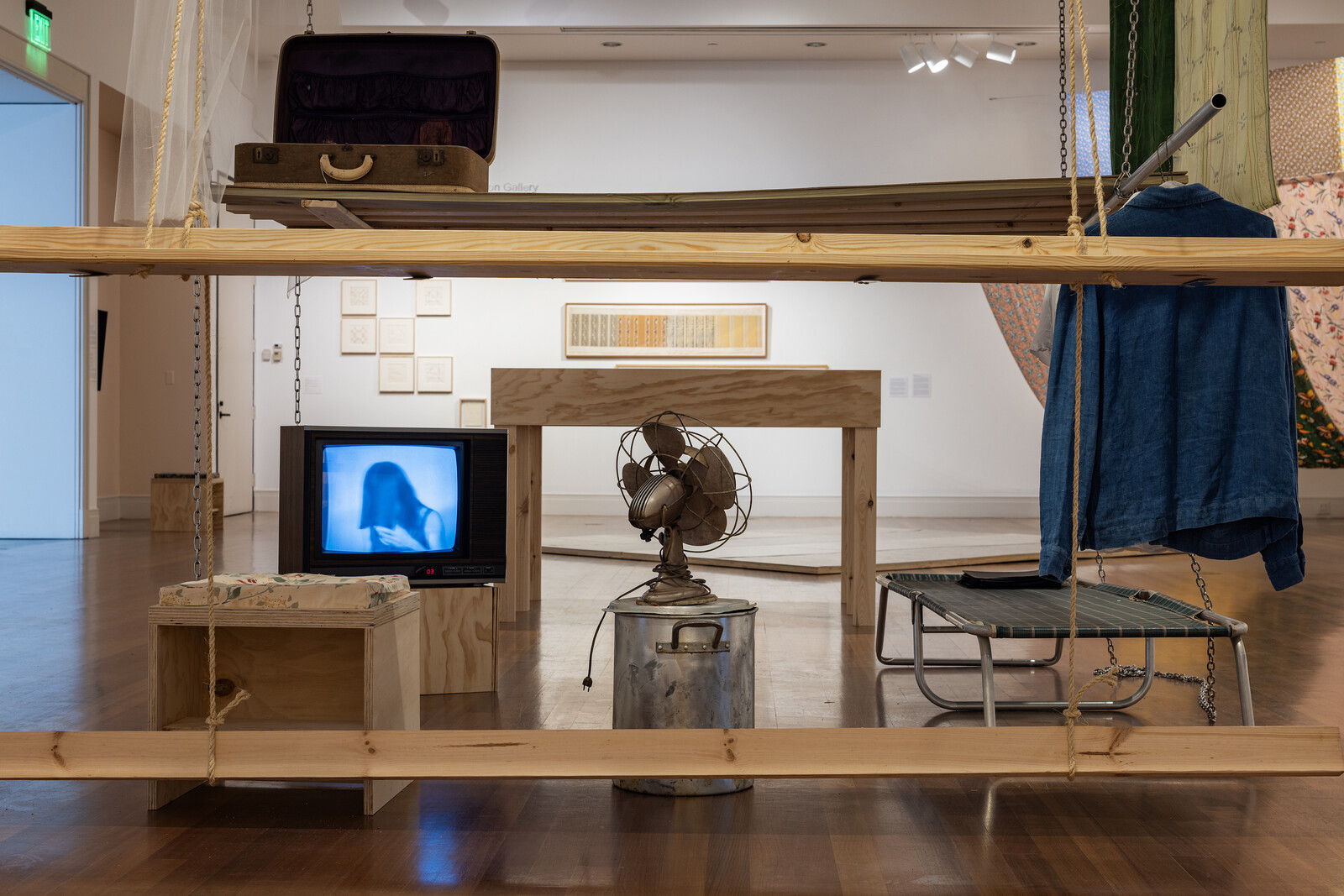 Curated by the Rivers Institute’s Andrea Andersson at the Ogden Museum, “Tina Girouard: SIGN-IN” traces a narrative from the artist’s early improvisational performances to her later, meticulously embellished textiles, which the “Solomon’s Lot” materials serve to bridge. Part of her wedding dowry, the set of silks was named for an uncle of Girouard’s partner Richard “Dickie” Landry, with whom she moved to Mary Heilmann’s Chinatown loft in 1969, shortly after graduating from the University of Southwest Louisiana. Both artists had Cajun heritage, and each summer Girouard continued to visit her family home in Acadiana, the state’s southernmost region, where she sourced the materials that would become the lynchpin of her performances.1