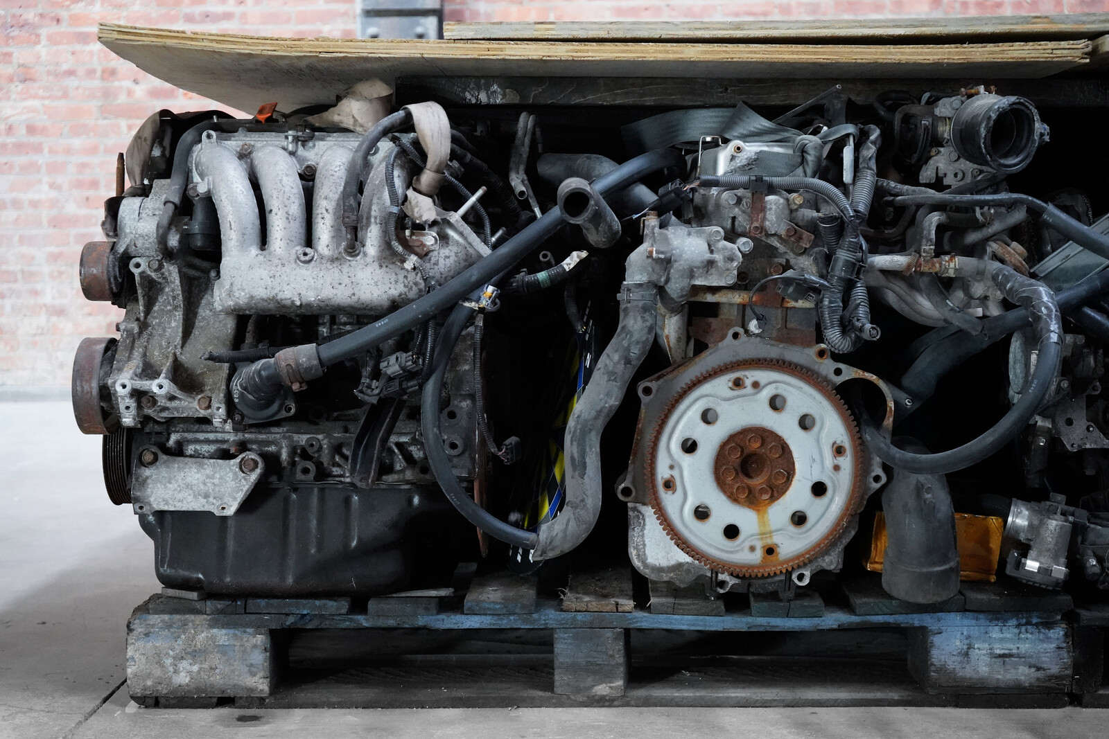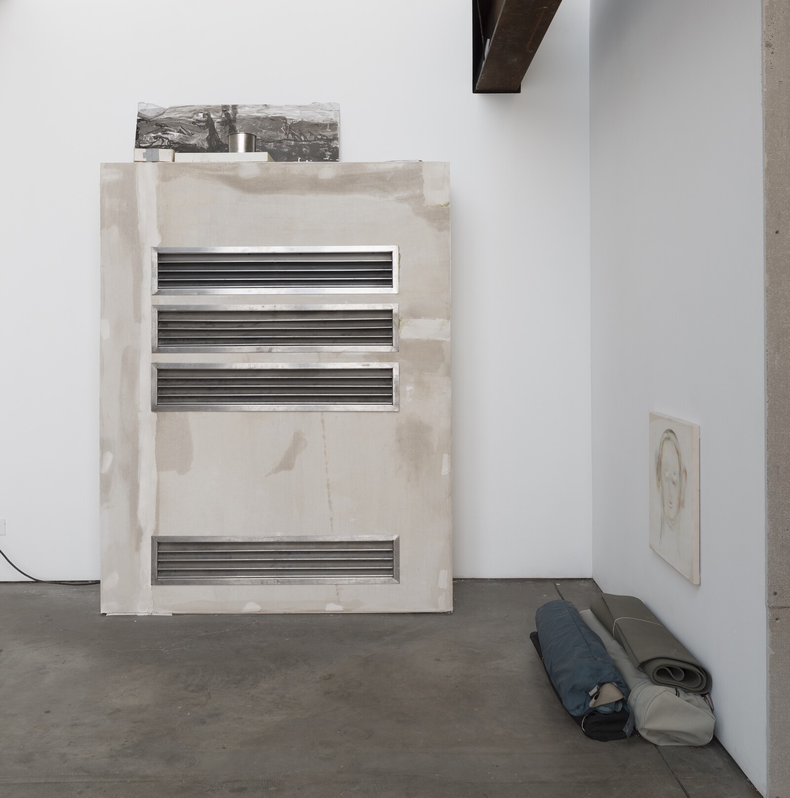 As she did with two recent exhibitions in Germany, Astakhishvili incorporates collaborative projects and works by peers into her installation—an extension of, rather than challenge to, authorship. A microcosm of the exhibiting institution, her fabricated environments become fleeting hosts for her own and others’ artworks.1 The first sculpture visitors encounter is Astakhishvili’s The endless House (all works 2024 unless otherwise stated), a freestanding cement and particleboard wall modeled on those found in the building’s basement. The structure’s narrow cavities harbor a sculpture and photograph by Katinka Bock and reverberate with the sound of approaching horns. Similarly evoking locomotion, the car engines sandwiched between warped plywood and pallets in The art of sleeping purr with the audio of rumbling motors. Composed from field recordings with frequent collaborator Dylan Peirce, these and other soundtracks permeate the gallery and confuse our perception of interior and exterior, actual and represented.