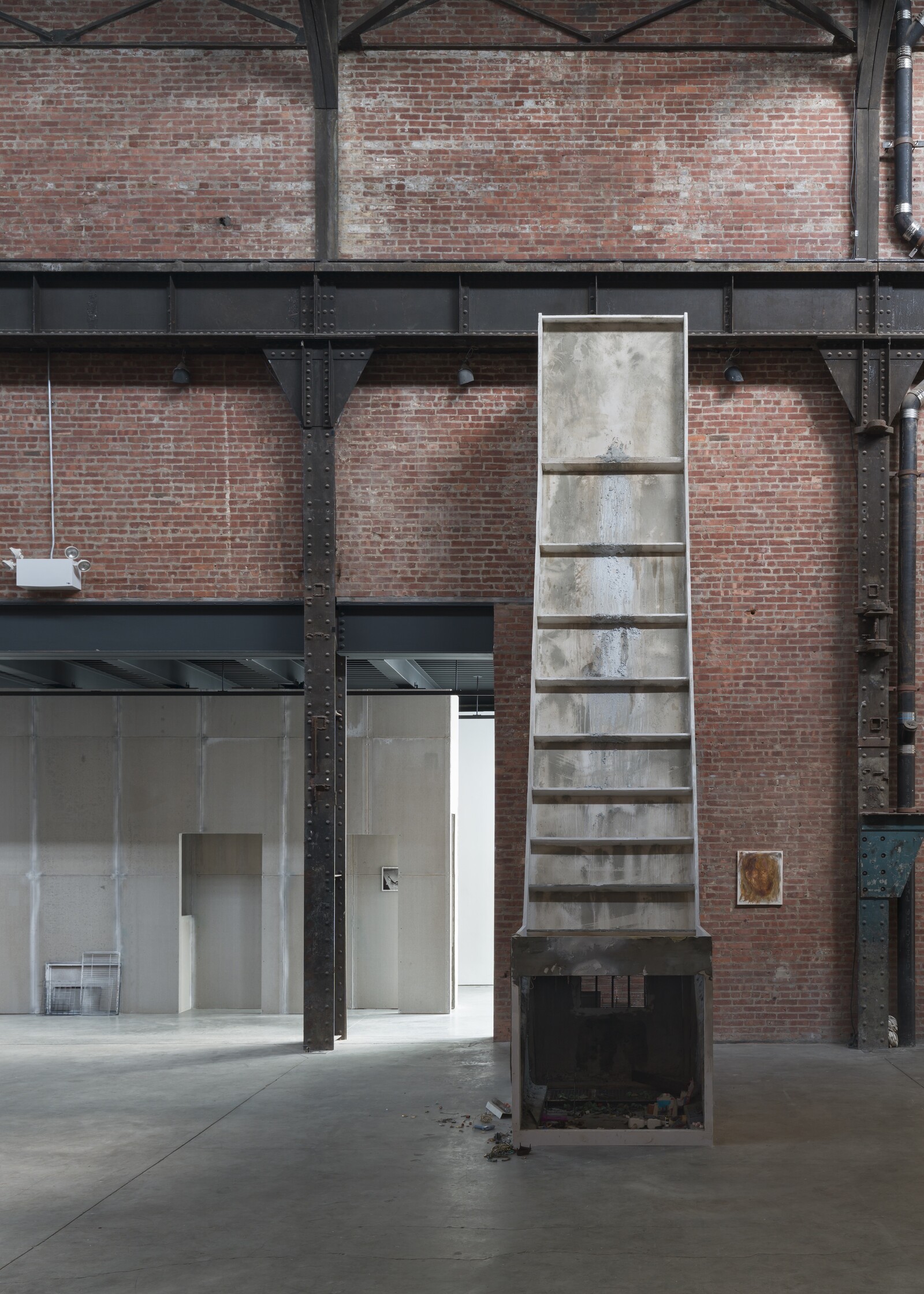 Built from conventional architectural materials including drywall and cement, and later stained with coffee, dirt, and pigment to mimic the wear and tear of time, Tolia Astakhishvili’s installations hover between construction and destruction. SculptureCenter’s brick and cast-iron building, initially designed for repairing trolleys and later used to manufacture derricks, hoists, and cranes, proves a fitting host for the Georgian artist’s first exhibition in the United States. Having previously explored the mutability of domestic spaces, and how they accumulate the marks and alterations of their inhabitants, Astakhishvili here contends with a formerly industrial site, while still remaining focused on what spaces tell us about humans come and gone.