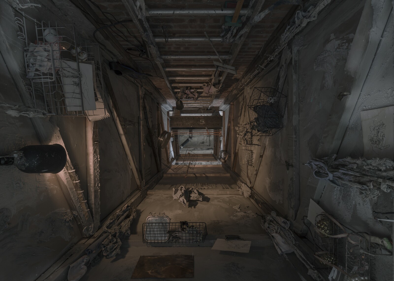 Capped with grates and lined on the inside with coat hooks and wire shelves that catch tumbling objects, the shafts double as filters. What passes through and what gets sifted out becomes a bleak metaphor for the movement of people. With so much apparently left behind—abandoned in haste but not necessarily discarded—it’s hard not to think of buildings hurriedly evacuated during a war or natural disaster. People like us in war, an ink drawing on a torn piece of board that depicts silhouetted figures trudging across a barren landscape, makes the issue of forced emigration more explicit.2 With its desolate spaces, fabricated deterioration, and castoff belongings all alluding, if obliquely, to involuntary displacement, Astakhishvili’s exhibition is especially impactful in this historical moment.