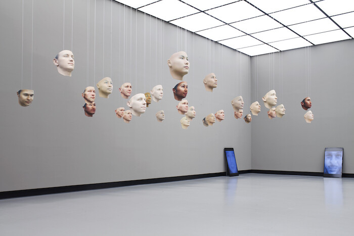 Suspended from the ceiling on lines of monofilament, the portrait objects are hollow shells reminiscent of ancestral death masks. Their placid expressions and blind eyes contain a hint of Buddhist charm that turns eerie when hued with the oversaturated dyes that fail to replicate dermal luminosity. The portraits attain peak bizarreness from a posterior view because they look exactly the same only inverted, like a face that has been sucked into itself. For better or worse, they are Januses, too, and in light of Sybille Krämer’s language beast, we should consider ourselves lucky they cannot talk.