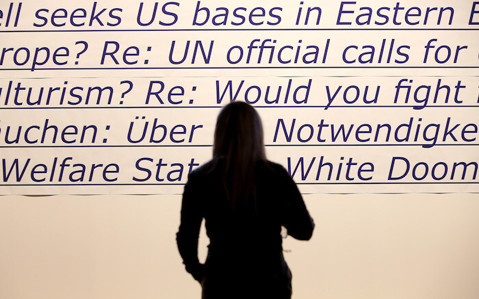 If one finds the underlying dangers of linguistics to be less than riveting, then it is only a matter of turning one’s attention to Nick Thurston’s Hate Library (2017) to fully appreciate the immediacy of Krämer’s concerns. According to the artist, the installation consists of five-and-a-half components, including twelve music stands arranged in a circle (referencing the EU flag); twelve comb-bound books containing exhaustive collections of hate speech; and three walls also mostly filled with hate speech. Engaging procedural contemporary poetics, Thurston culled his source material from the online chat rooms of extreme right-wing communities, and he did so with apparent ease and glut. The sheer quantity of text alone is chilling, and predictably the messages held within are appalling and dumb, but most disconcerting is its accessibility. If all of this vitriol is “just a few clicks away,” as the press release states, then the term far right is truly no longer an accurate description of distance.