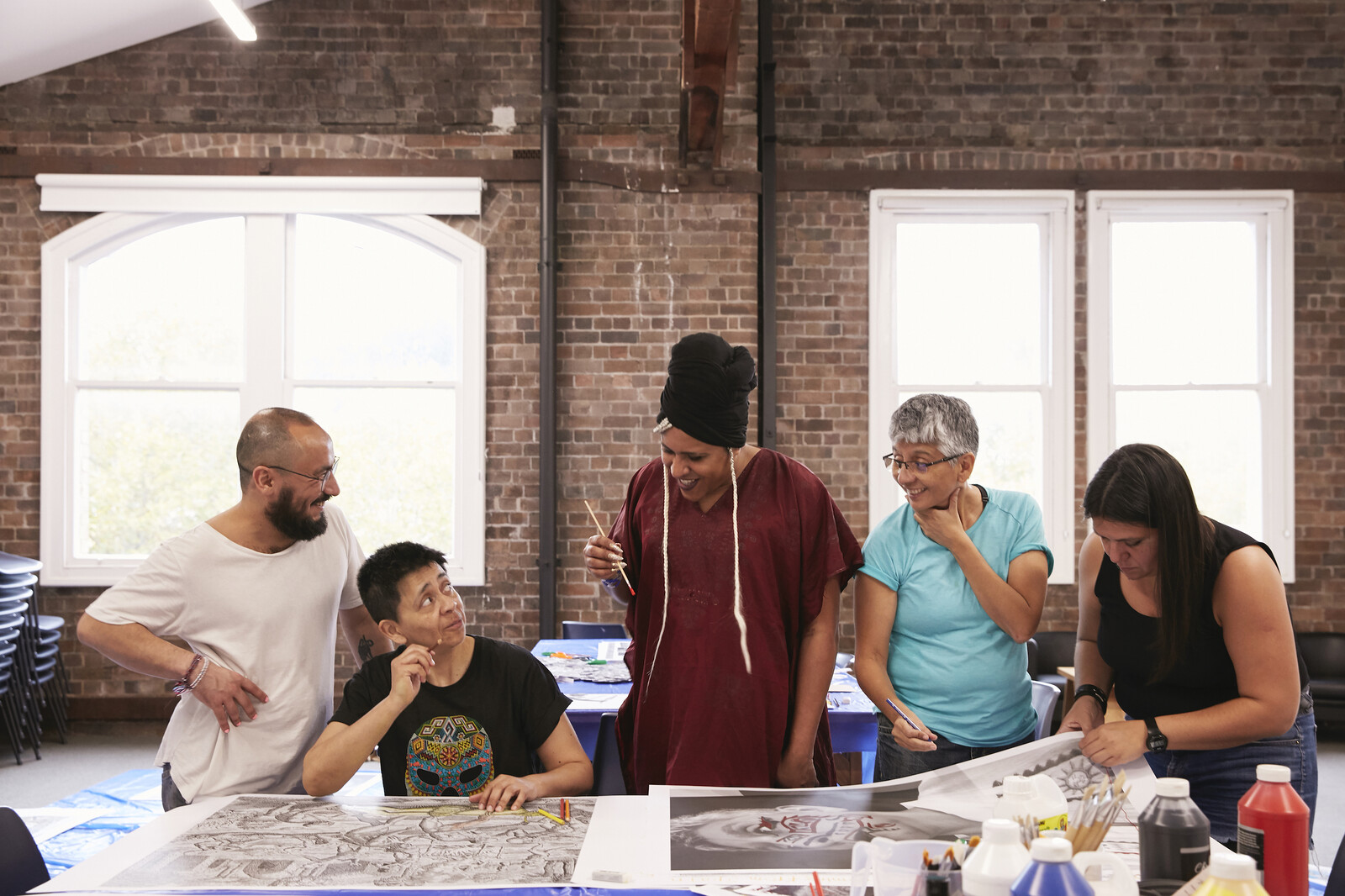 BA: The artists I worked with chose themselves. I was led to them through their emanative creativity and interconnectivity; from an invitation to a dinner to an invitation to visit a community. I responded to connections and vibrations that I felt. Walking through dhuluyanha ngiriyagarra yanhulabul (time) is an important way of life for me. Time itself is a construct, and it is impossible to hold people or the world “in time.” Therefore, I believe that I was guided by a Wiradjuri—my mother’s Aboriginal Nation—pathway.