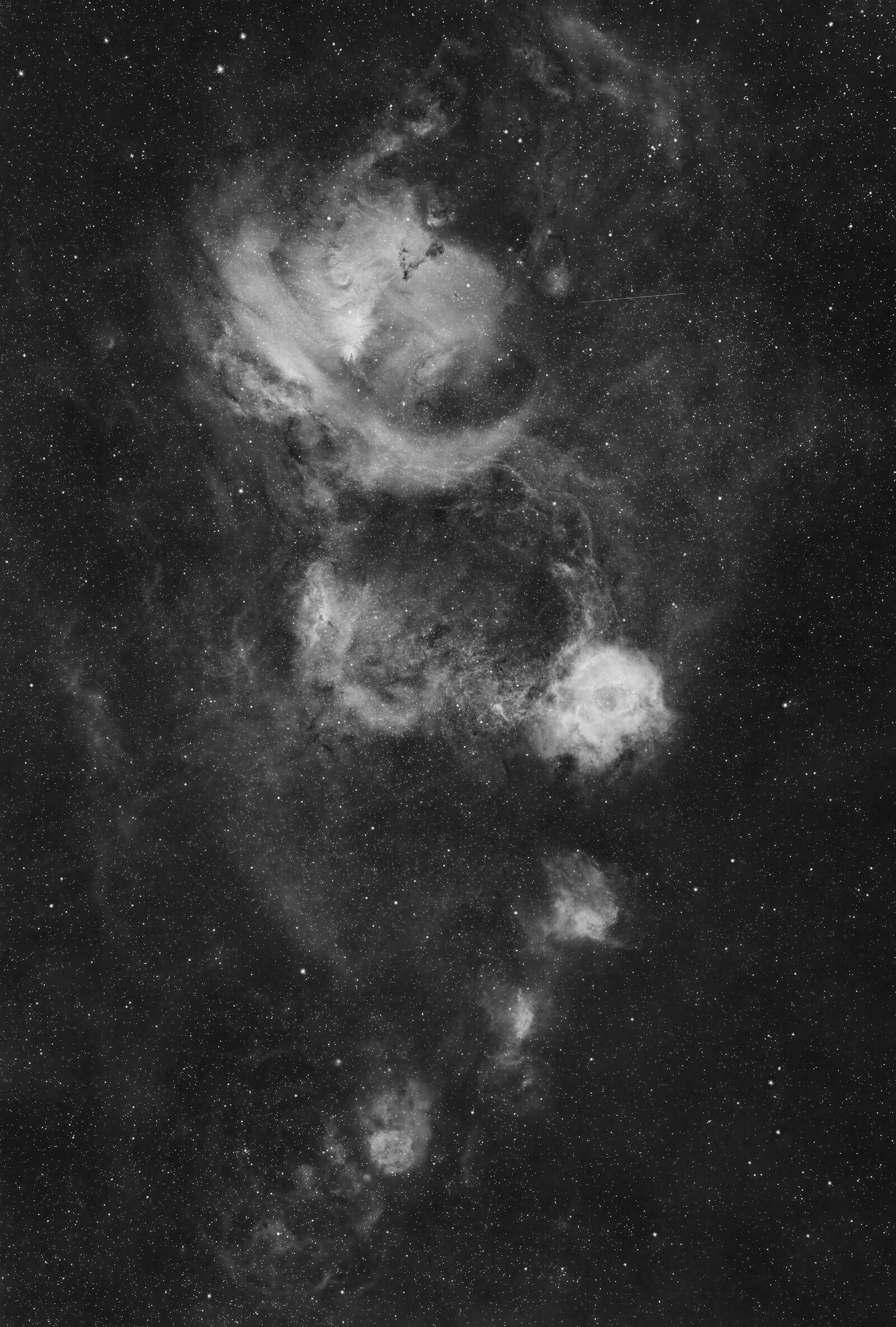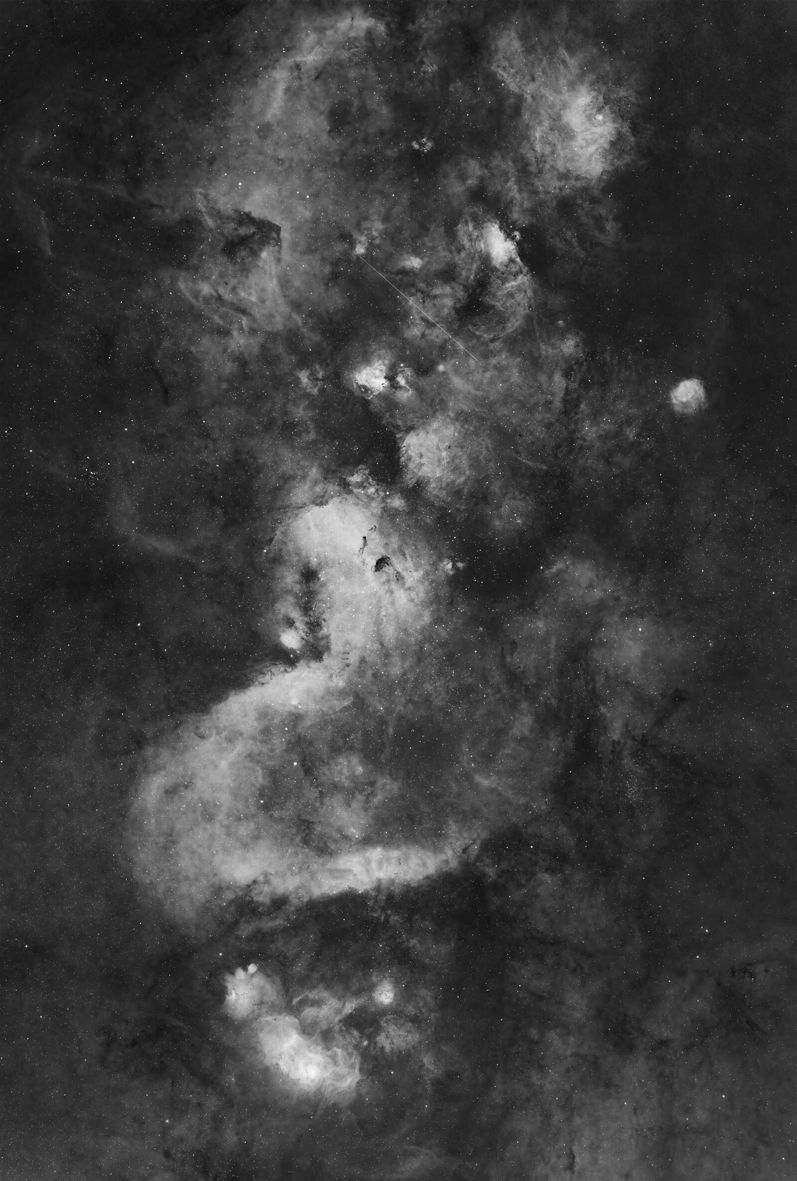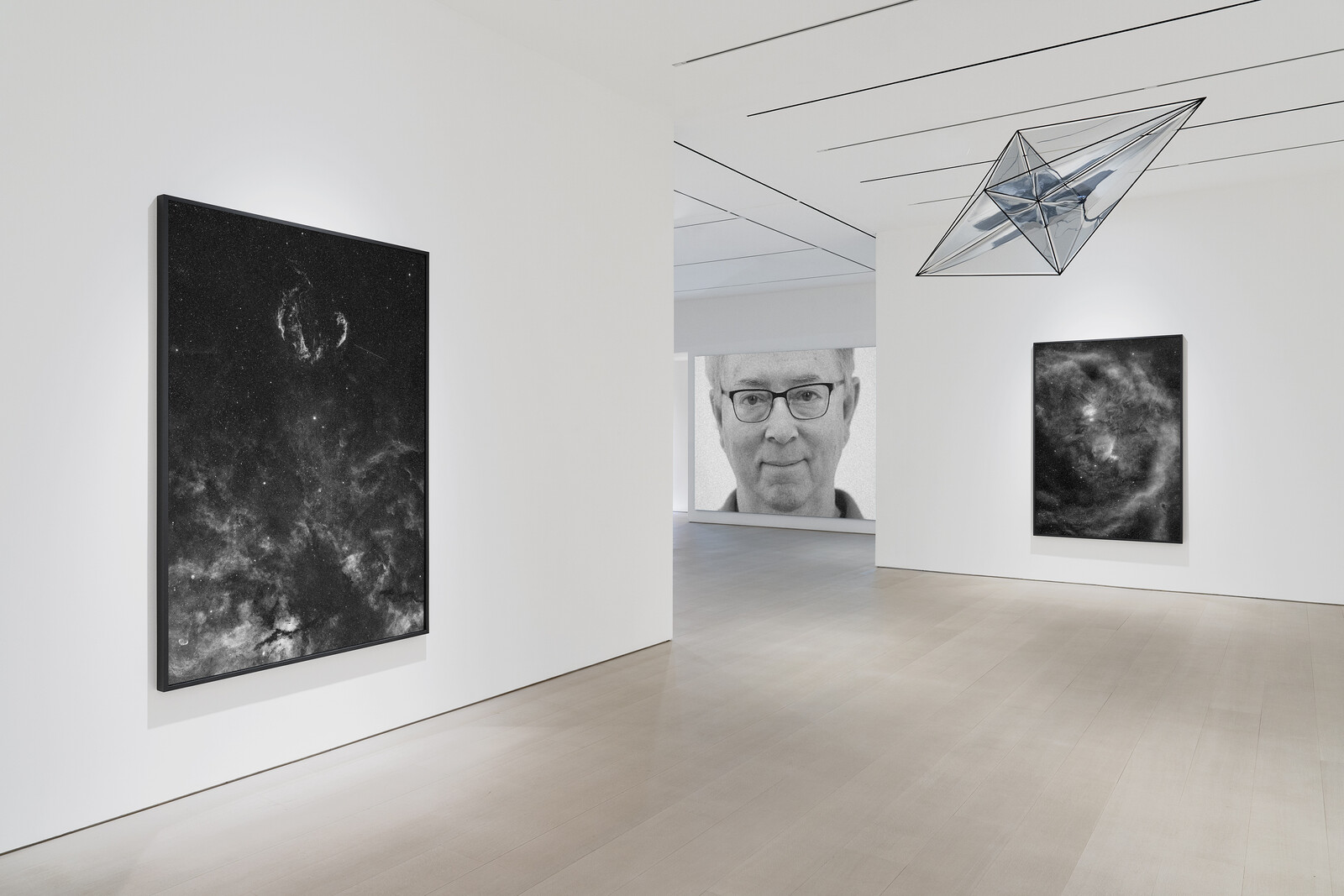 The object captured in the photograph titled UNKNOWN #83975 (Unclassified object near The Scutum Supershell) (2023), currently on display at Pace Gallery in New York, forms a razor-thin, white, diagonal line through the milky whorls of dust and gas made visible by an infrared camera affixed to a telescope and pointed at a clear night sky above Joshua Tree, CA. The evidence of the unknown object’s transit resembles a scratch on the large (80 x 54 inches) print. Without explanation and the context provided by the appearance of similar lines in other photographs in the series, I would have assumed that this line was some sort of flaw. And in some sense that is exactly what it is: matter out of place, garbage from broken satellites or menacing military operations in the midst of celestial perfection and order. People travel far for a sky clear enough to satisfy their desire to be awed by an untouched outside organized by extra-human laws. The unknowns are a form of literal and conceptual pollution.