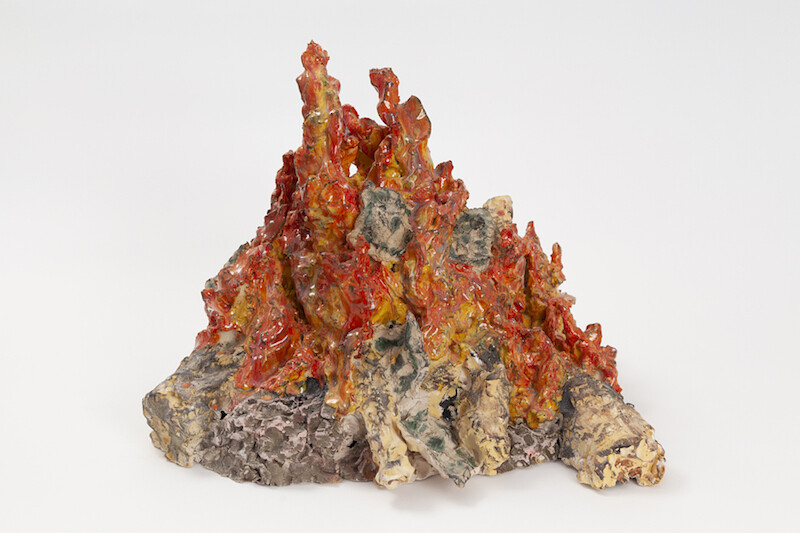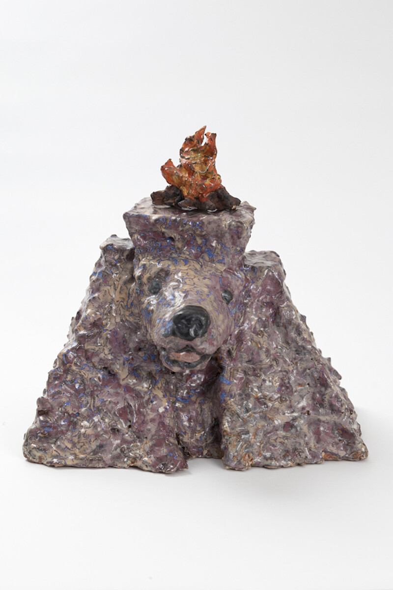 Baga has made more than 40 ceramic pieces of various sizes and dimensions representing an array of often comical real-world objects. There’s a full rock-band set-up, complete with drum set, guitar, and tip jar; a log fire; a cardboard box with the Amazon swoosh logo; a portrait of Baga’s dog, Monkey, swimming; and a quintet of poodle heads in the shape of Mesoamerican pyramids (temples of the dogs?), with titles such as Kimberly and Butchie (both 2018). Encountering life-sized versions of a crumpled rhinestone Elvis suit or a cockatoo in the gallery, you get the feeling of entering the artist’s psyche—or, simply, of her ideas made flesh, birthed into the world in a way that’s as simultaneously magical and quotidian.