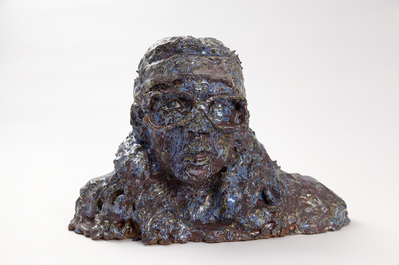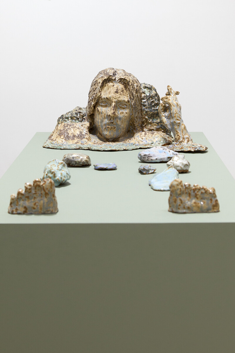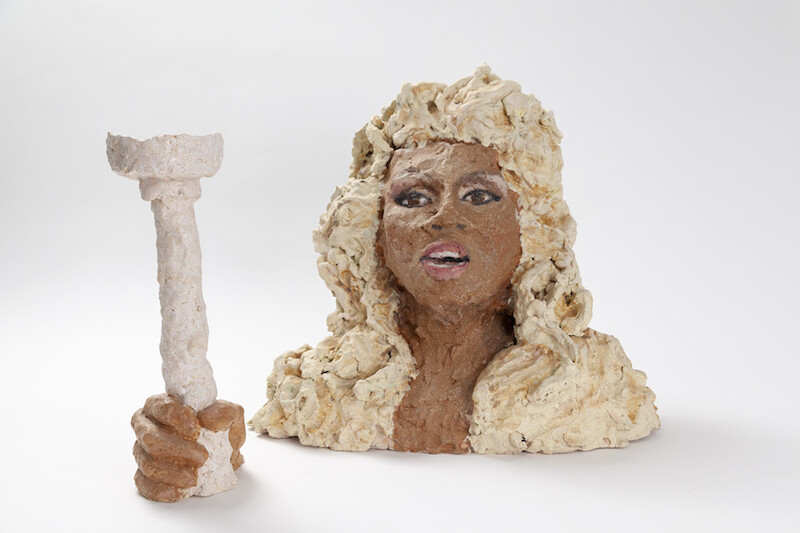 Baga’s ceramics have an amusingly DIY quality that both belies their complex material origins and butts up against the more high-tech elements of the show. Baga frames these contradictions as a set of encounters with the budget artificial intelligence of the virtual assistant. A pair of elaborate, life-sized busts—one depicting RuPaul, the other the artist herself—are both subtitled Calcified Encasing for Virtual Assistant (2018), and indeed you’ll find the devices embedded in the pottery. And the “Mollusca” of the show’s title, a homophone of Amazon’s Alexa, pops up throughout the exhibition as a recurring character, most notably in the video installation, which shares the show’s title.