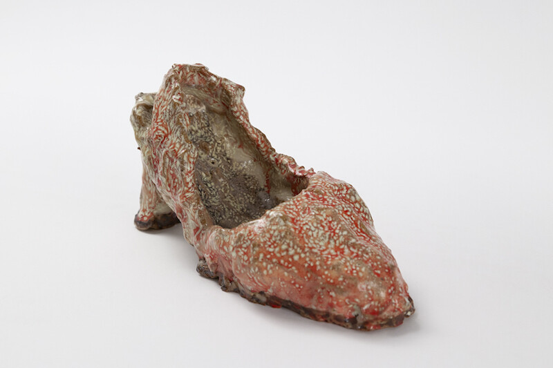 As your attention oscillates between the elements within the projection and around it, you get the distinct sense that they’re trying to speak to one another—that Baga is attempting to create a space of contact between virtual and material realms, inner and outer space. One touchstone for the exhibition is Frida Kahlo’s perspective-warping 1938 painting What the Water Gave Me, which depicts autobiographical elements floating in the tub near the painter’s partially submerged feet. Baga recreates the painting both within the video—with her own feet filmed in the bathtub as adobo and soy and hot sauce are added to the mix—and within the gallery space via a pair of human-sized ceramic feet at the base of the projection.