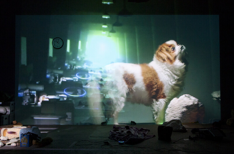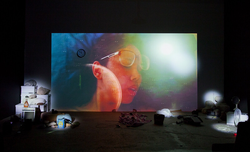 Behind a black vinyl curtain, the installation utilizes a bewildering combination of physical and projected materials. The 37-minute video comprises two simultaneous projections—one 2D, the other 3D—whose dense mass of imagery Baga has assembled from hilariously disjointed footage of her travels to caves in Sicily, a vacation with her family in the Philippines, rips of Hollywood sci-fi movies (including Contact and the recent Jumanji reboot), experiments in the artist’s studio, cosmic swirls, and the flat digital space of a computer’s desktop. The simultaneous projections and their combination of monoscopic and stereoscopic images play with your sense of reality, an effect compounded by the presence of both found and handmade objects placed around the room that are activated by the imagery. The projector beam occasionally irises a clock on the wall of the gallery, and spotlights other knick-knacks and tchotchkes (salad dressing bottles, rocks, fans, bankers boxes), subsuming them into the video’s bizarre, meandering space-time. Seated in one of several X Rocker–brand gaming chairs in the center of the room, you see shadows of what might be people walking behind you. Depending on how busy the gallery is, these might be real; more likely, they are projections of Baga’s own silhouette. (A couple of times, I couldn’t really tell.)