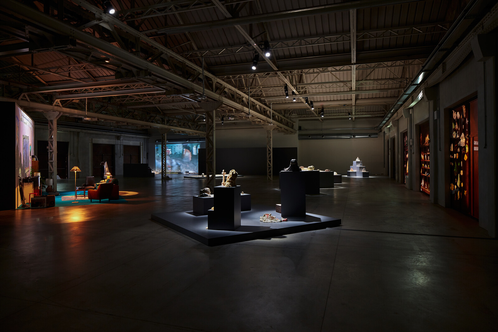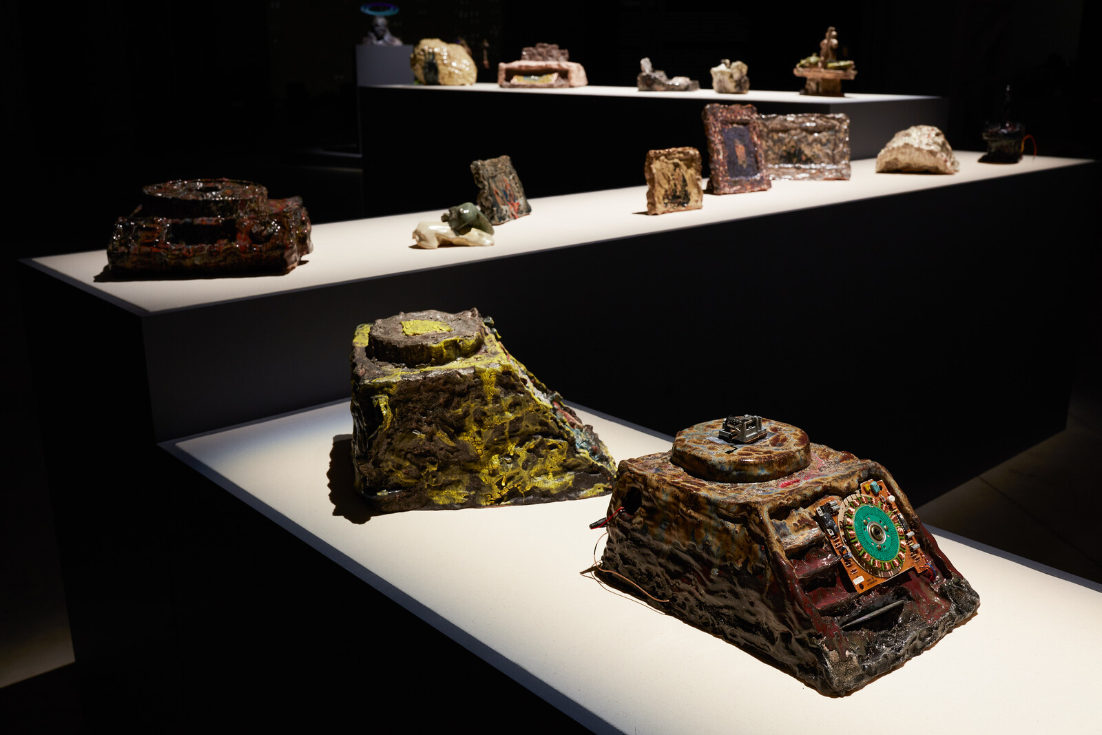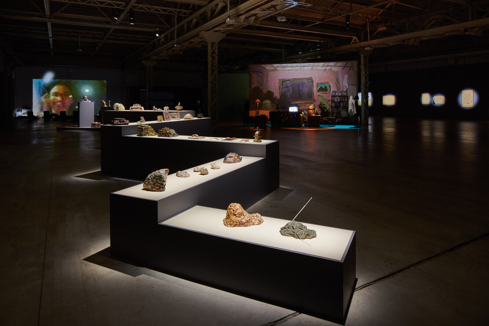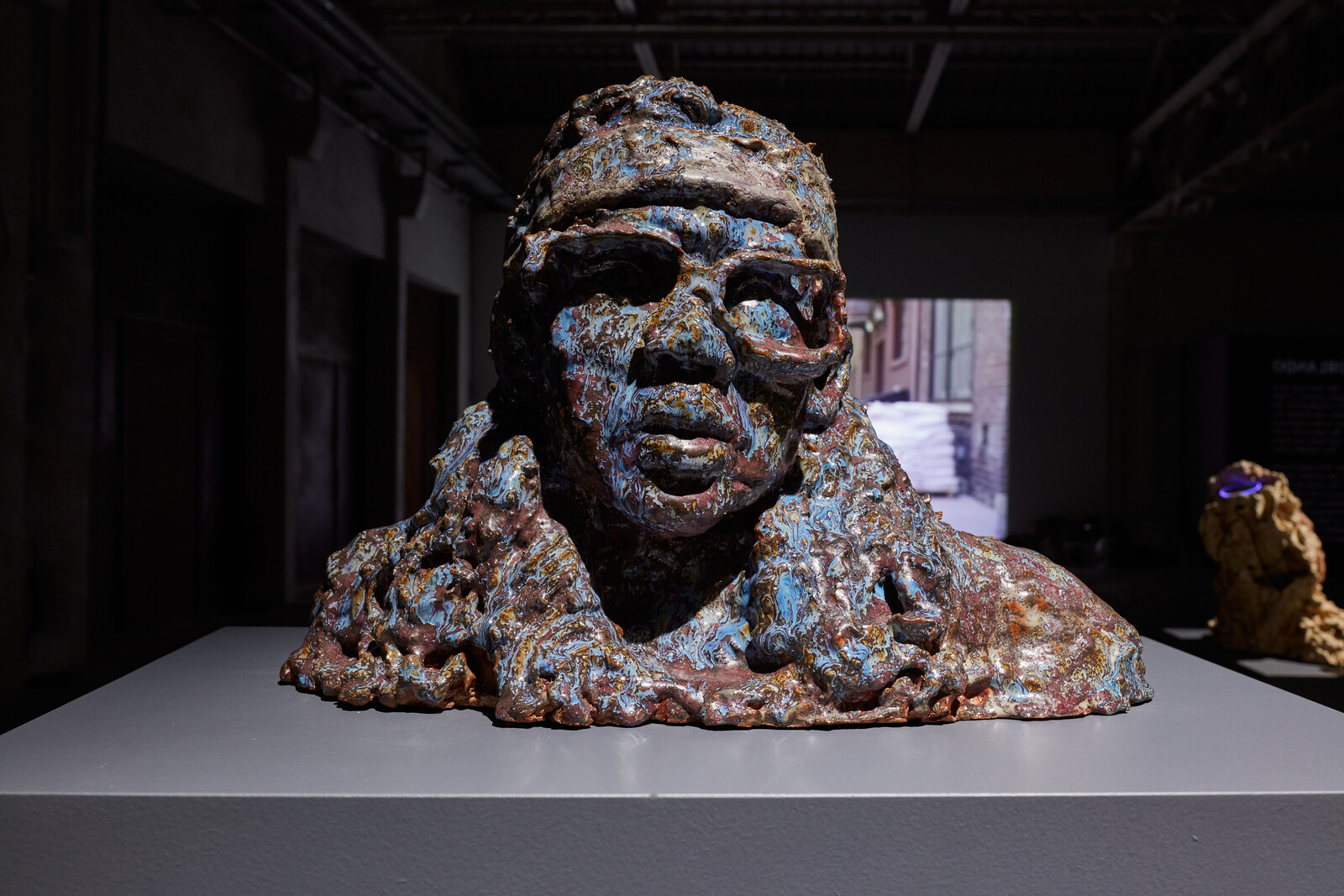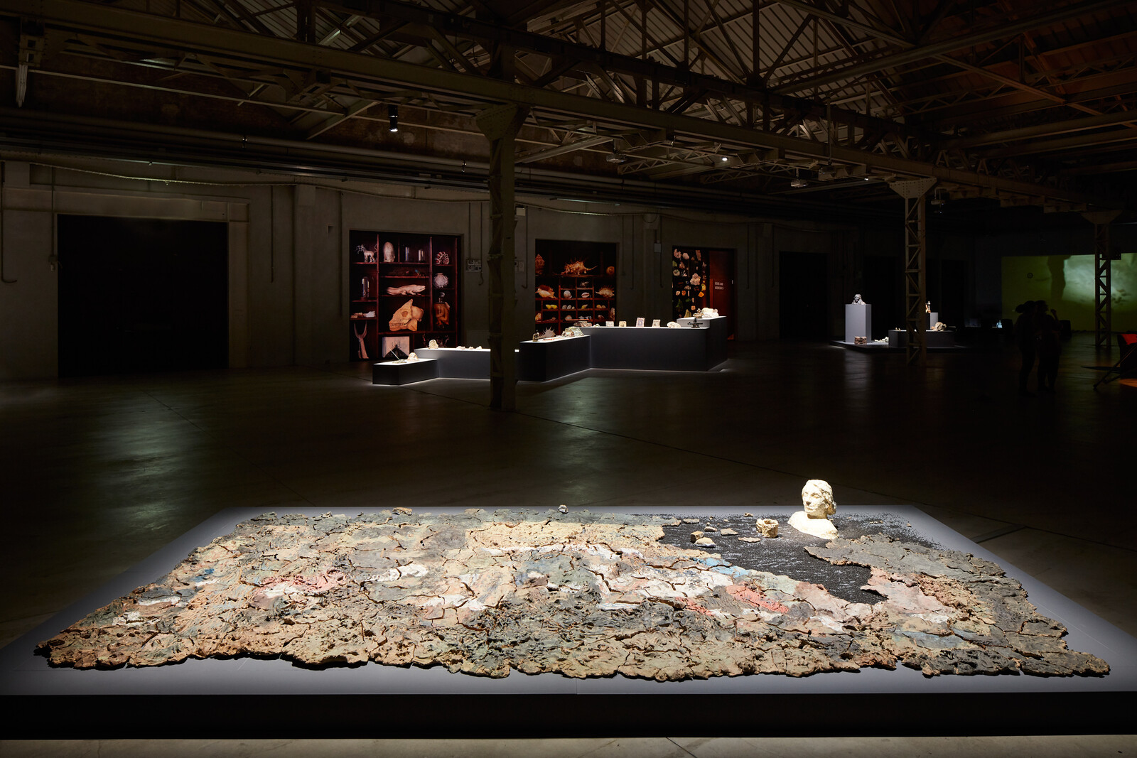 The “Hypothetical Artifacts” are displayed to one side of the dark, majestic spaces of Pirelli Hangar Bicocca—a cathedral-like black box both geographically and architecturally opposed to the light-flooded, neo-Renaissance Prada Foundation citadel on the other side of Milan. Nearby, another group from the same series—ceramic poodle heads resembling flame-topped Sphinxes—are placed on a pyramidal plinth. Both display surfaces bring to mind the theories of the local Renaissance painter Gian Paolo Lomazzo (1538–92), who proposed the forma serpentinata (“serpentine shape”) and the pyramid as ideal vessels for the decidedly anti-naturalist figuration of Mannerism, a style that he helped to develop.