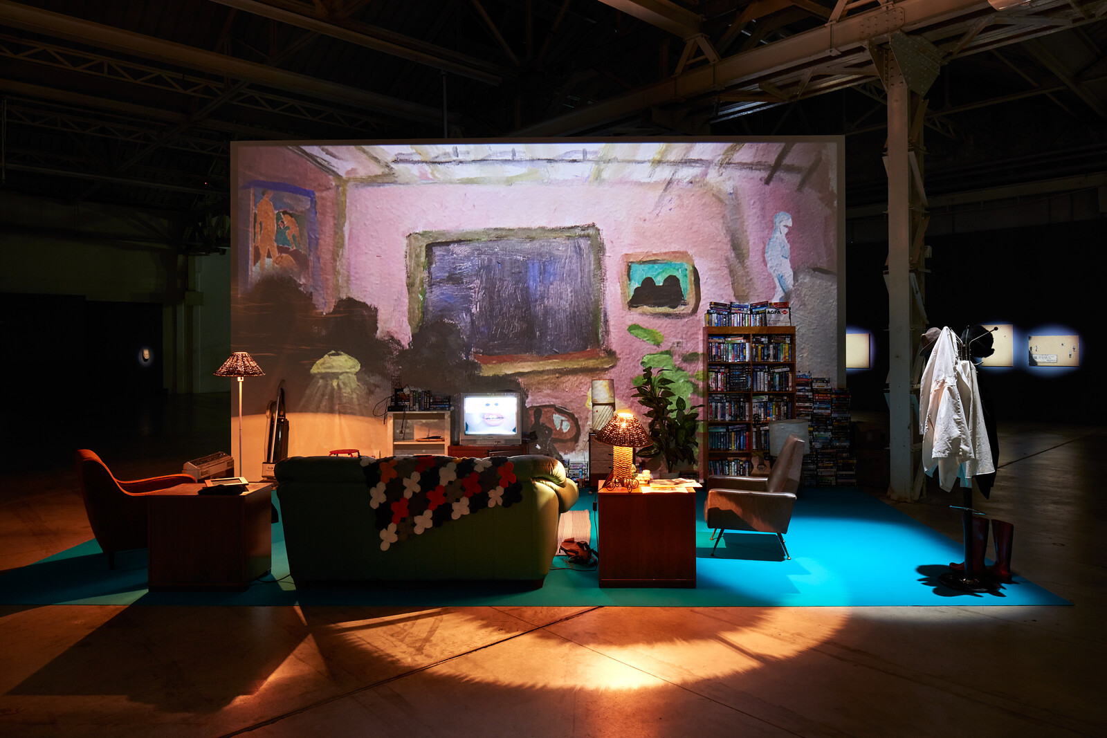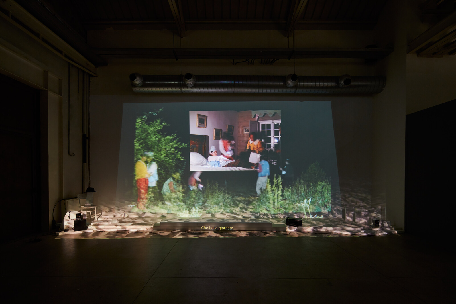 Contrary to the press materials for Trisha Baga’s “the eye, the eye and the ear,” which liken the presentation to that of a natural history museum, the New York-based artist’s first institutional exhibition in Italy recalls the Egyptian Theater fad of golden-age Hollywood. A procession of “Hypothetical Artifacts” (2015–20), a series of ceramics sculptures precisely arranged on a plinth that zig-zags like a snake, offer the first hint of an architectural craze that followed the 1922 discovery of Tutankhamen’s tomb. In this “geological corridor of evolution,” as the artist describes it, everyday objects such as picture frames, a printer, and a microscope are rendered like fossilized movie props. Several of these pieces appear in video installations positioned around the darkened gallery. Spot-lit and decorated with plants, lamps, furniture, and other items, the installations resemble sets on a soundstage.