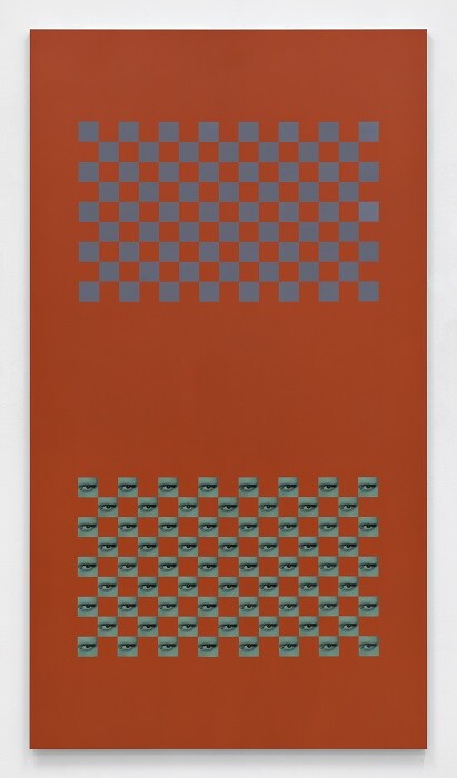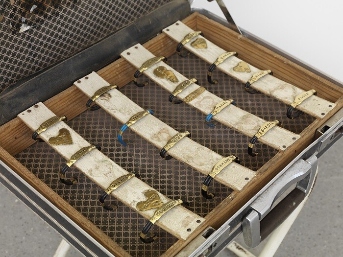 Mitchell Anderson’s Je suis noir dedans et rose dehors [I am black on the inside and pink on the outside] (2015)—a gessoed board hung on the wall showing orderly rows of playing cards of male sport stars—triggers the title’s associative racial and sexual ambiguities. His Bracelet briefcase piece (2015), an object bought outside a Marrakech mosque, exudes dark vibes. Unscrupulously transplanted to the white cube, the names inscribed on the bracelets in this carry-on coffin—“Shadia,” “Othmane,” “Dalina,” et al—reverberate like young lives sold and consumed.